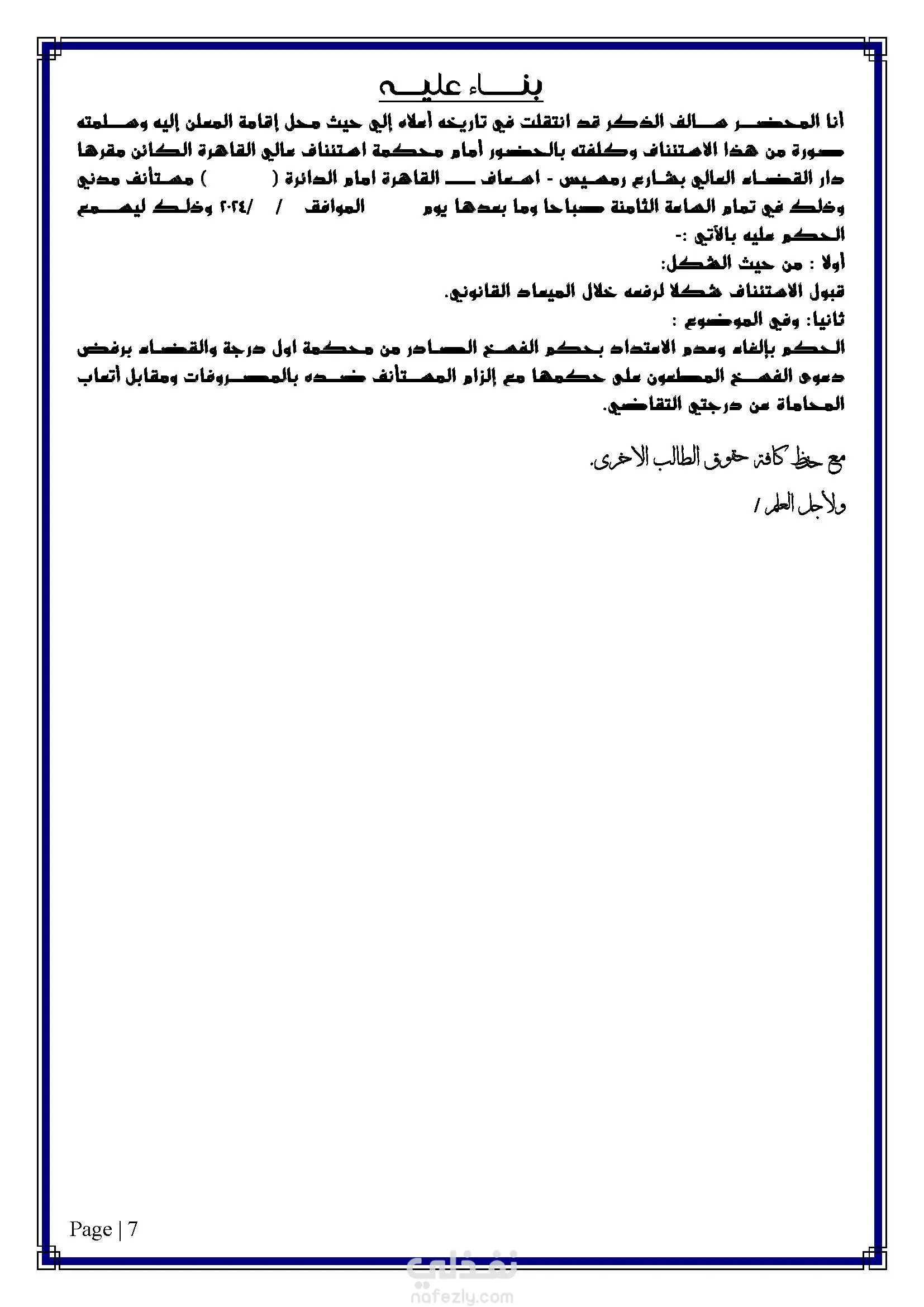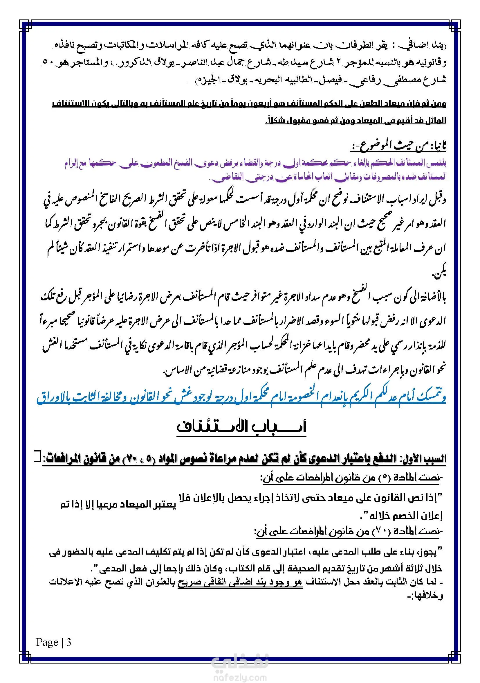 صحيفة طعن بالاستئناف على حكم صادر بفسخ عقد ايجار