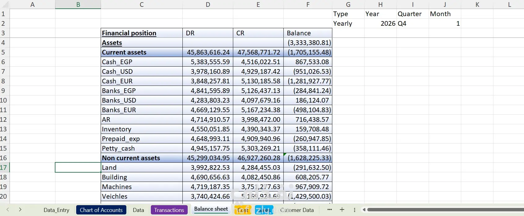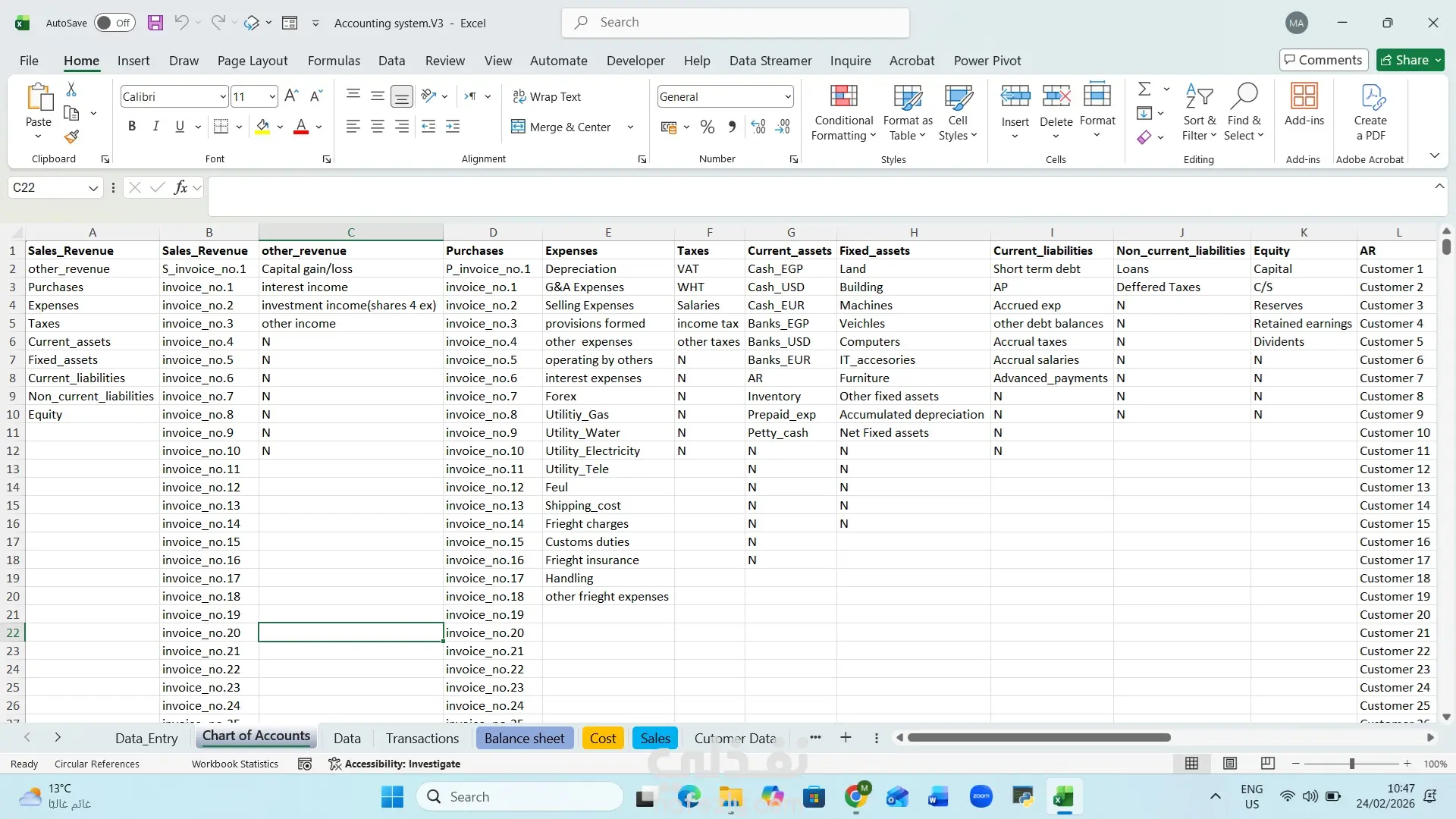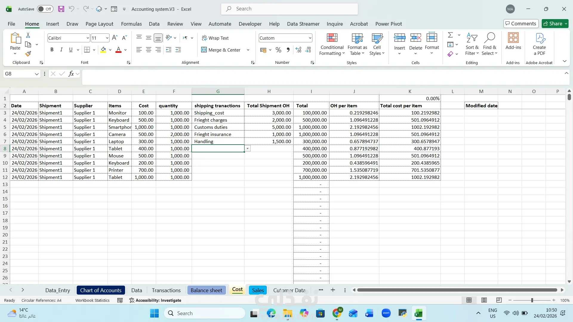 نظام ذكي ودقيق يسهل عليك نظام ادخال متميز النظام يحتوي على لوحه تحكم في ادخال البيانات تعمل بنظام الماكرو وتقوم بنقل القيود المحاسبيه تلقائيا في شيت المعاملات الرئيسي شيت اكسيل يعمل كنظام ERP متكامل الشيت تفاعلي ومترابط ويسهل ربط او حذف بعض مهامه فهو يعمل مثل اي نظام ERP يحتوي عاده على نظام باقات فيمكنك شراء باقه كامله بها كافه الخدمات الاساسيه في حاله احتياجك لها ويمكن شراء باقات اصغر على حسب الحاجه الشيت يعمل بنظام ادخال موحد لتفادي الاخطاء بشكل كامل الشيت يعمل بنظام القوائم المنسدله التفاعليه فحضرتك مش هتحتاج تكتب حاجه خالصالشيت يعمل بنظام الاختيارات كل اللي عليك تدوس عالزرار وتختار من القائمه القيد المناسبه للعمليه وتكتب جنبه المبلغ وبكده انت عملت قيد محاسبي بكل سهوله الشيت يدعم اللغتين العربيه والانجليزيه حسب اختيارك لو عايز تعمل حساباتك بالعربي او بالانجليزي فاحنا هنفذلك طلبك بكل سهوله لان البرنامج تفاعلي وسهل التغيير فيه الشيت هيساعدك تعمل تحليل لكل شحنه هتدخلها الشيت ممكن يحلل كل شحنه بضائع هتدخلها ويضيفلك عليها كل مصاريفها عشان تعرف تقيم مخزنك بشكل سهل جدا وتعرف كل قطعه عندك بكام الشيت يقدم يقدملك سعر استرشادي لكل قطعه هتبيعها الشيت يقدر يقولك كل قطعه مينفعش سعرها يقل عن كذا ويبقى عامل حسابه في مصاريفك كلها وكمان يعمل حسابه على نسبه الربح اللي انت عايزها عشان تبقى دايما مركز و متضيعش راس مالك بسبب نقص المعلومات