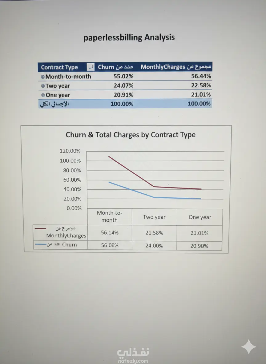 • نوع التعاقد: العقود الشهرية تمثل 55% من حالات خسارة العملاء، مما يتطلب استراتيجية استبقاء أقوى.