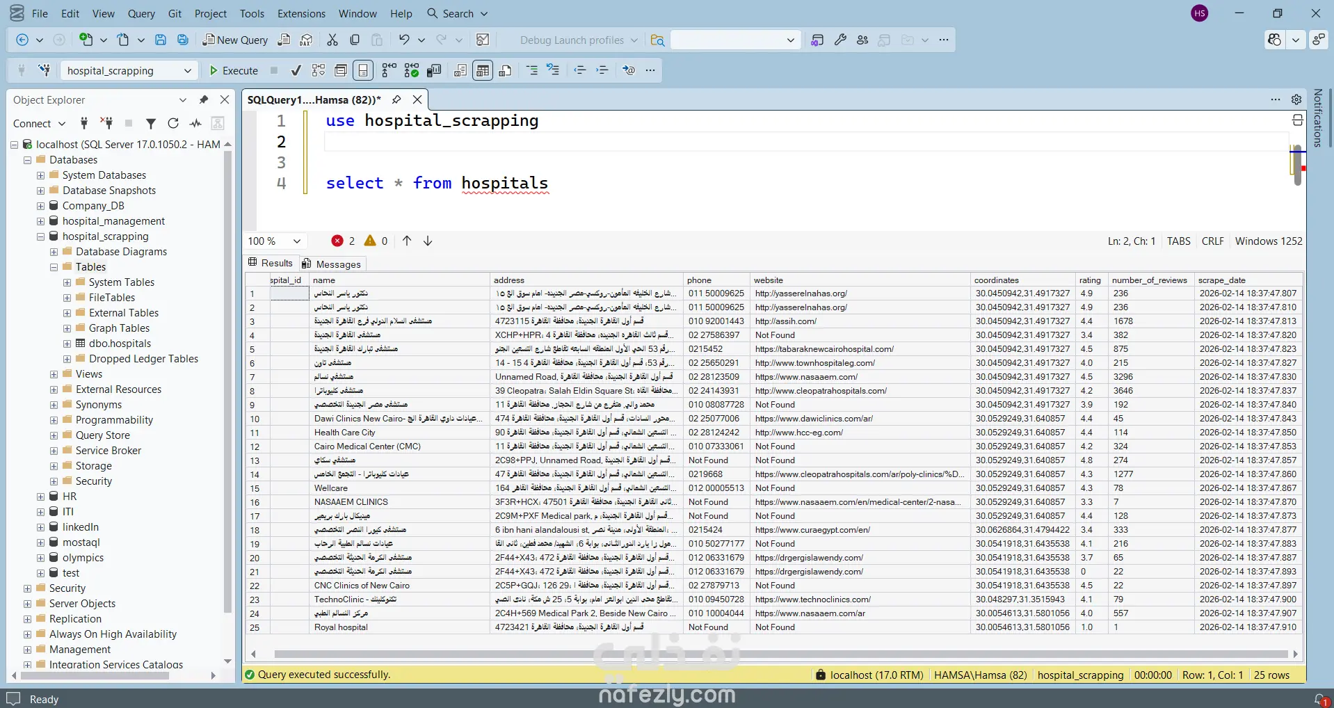 المشكلة (The Challenge): - تشتت البيانات: صعوبة حصر المستشفيات بسبب بعثرة المعلومات على الخرائط. - ضعف الدقة: وجود بيانات مكررة أو غير مكتملة يعيق اتخاذ قرارات إحصائية صحيحة. - غياب الرؤية: صعوبة تحليل التوزيع الجغرافي أو تقييم جودة الخدمات بسبب القوائم التقليدية غير المنظمة. الحل (طريقة التنفيذ): - الاستخراج (Web Scraping): سحب بيانات 25 منشأة صحية من Google Maps بدقة (أسماء، هواتف، إحداثيات، وتقييمات). - التنظيف والهيكلة: معالجة القيم المفقودة وتصميم قاعدة بيانات SQL Server لضمان ترابط الجداول ومنع التكرار. - العرض التفاعلي (Dashboarding): بناء لوحة تحكم بـ Streamlit تتيح تصفية البيانات حسب المنطقة والتقييم، لتحويلها لأداة بحث ذكية. الأدوات المستخدمة (Tools): Python (Selenium/BeautifulSoup): لسحب البيانات. - SQL Server: لتصميم وإدارة قاعدة البيانات. - Streamlit & Excel: لتطوير لوحة التحكم وتسليم البيانات بصيغة احترافية منظمة.