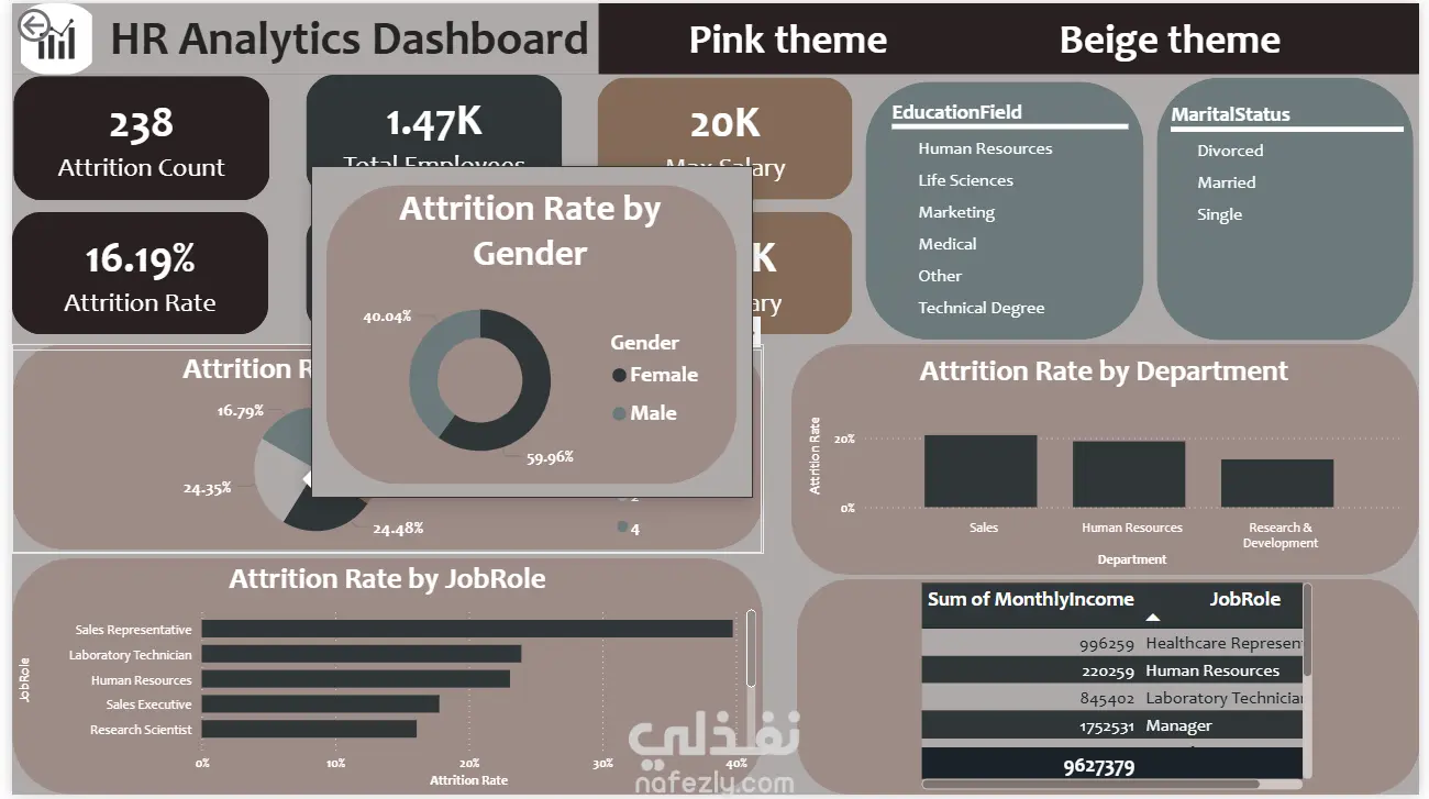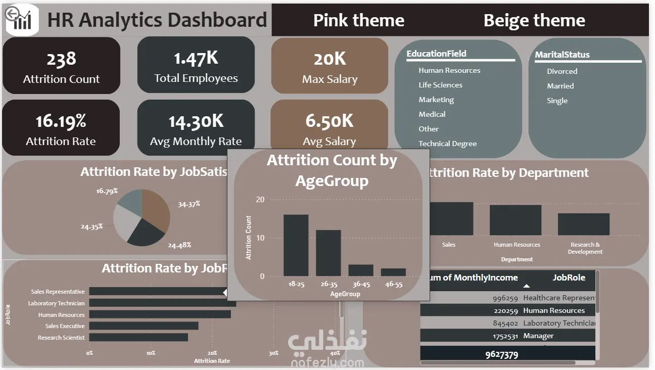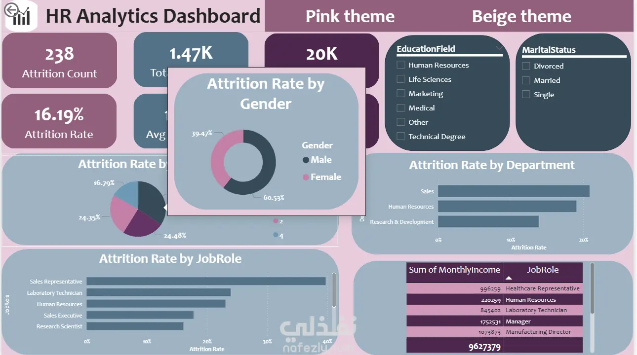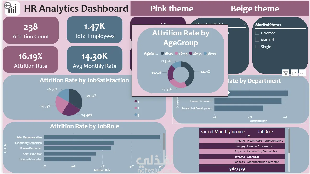 قمت بتصميم لوحة تحكم تفاعلية لتحليل بيانات الموارد البشرية باستخدام Power BI، تتضمن: 1-تحليل معدل دوران الموظفين (Attrition Rate) بنسبة 16.19% من أصل 1,470 موظف 2-تصورات بيانية توضح معدل الدوران حسب القسم، الوظيفة، الرضا الوظيفي، والجنس والفئة العمرية 3-مؤشرات رئيسية (KPIs) تشمل متوسط الراتب، الحد الأقصى للراتب، ومتوسط المعدل الشهري 4-فلاتر تفاعلية حسب مجال التعليم والحالة الاجتماعية 5-تصميمان مختلفان: Pink Theme و Beige Theme 6-متوافقة مع عرض الموبايل