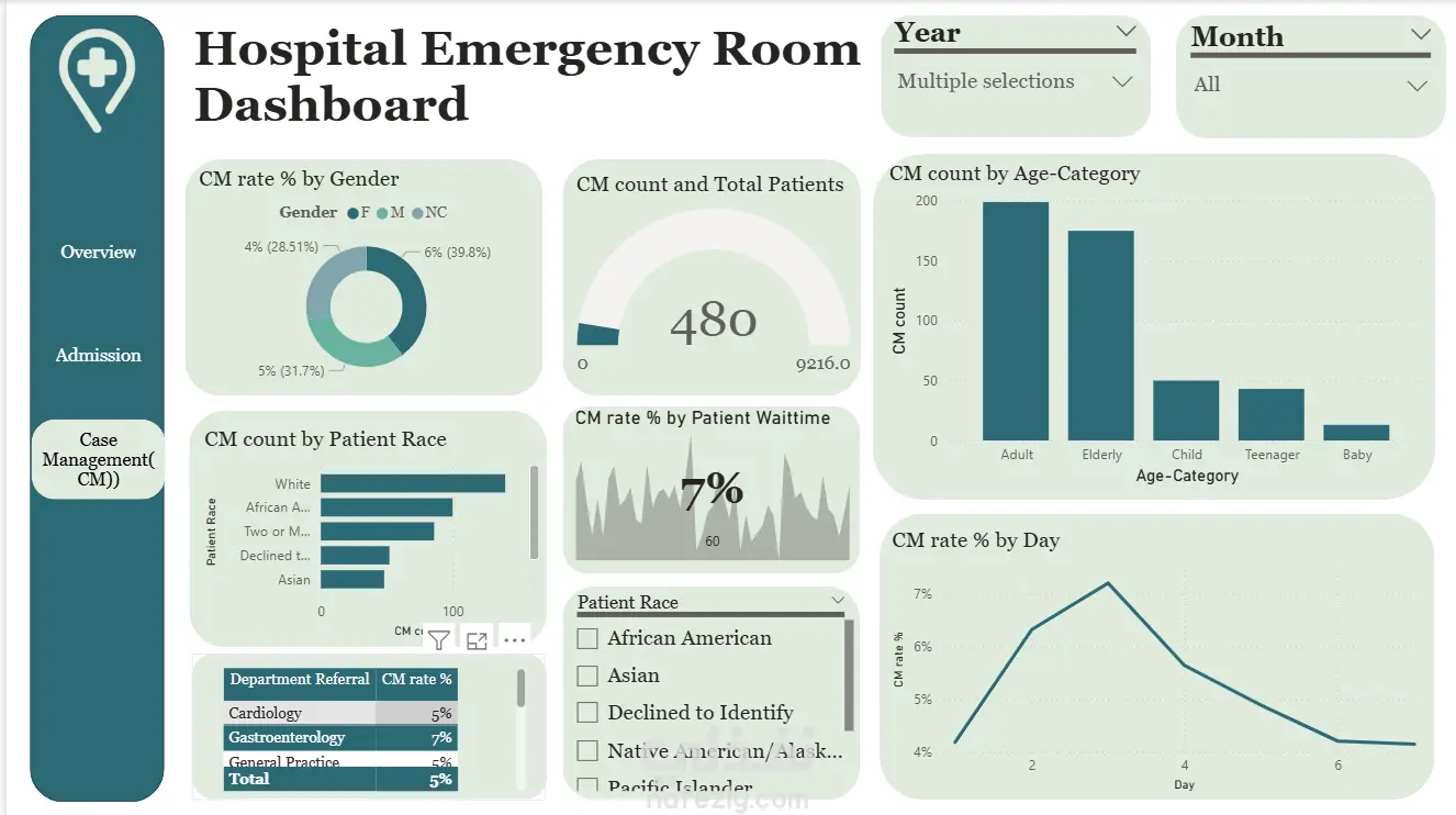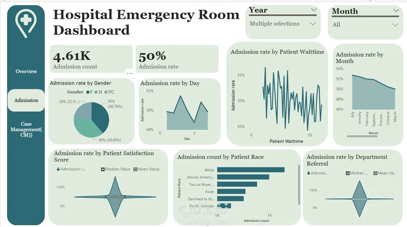 قمت بتصميم لوحة تحكم تفاعلية لتحليل بيانات غرفة الطوارئ في المستشفى، وتتكون من 3 صفحات رئيسية: 1. Overview: يعرض إجمالي المرضى (9.2K)، متوسط وقت الانتظار (35 دقيقة)، متوسط رضا المرضى، توزيع المرضى حسب الجنس والعمر والعرق والشهر. 2. Admission: تحليل معدل الدخول (50%) من أصل 4.61K حالة، مع تحليل تفصيلي حسب الجنس، اليوم، الشهر، وقت الانتظار، العرق والقسم الطبي. 3. Case Management (CM): تحليل حالات إدارة الحالات (480 حالة)، معدل CM حسب الجنس والعرق والعمر واليوم والقسم الطبي. تتميز اللوحة بفلاتر تفاعلية حسب السنة والشهر والعرق، وتصميم احترافي بألوان Teal وأخضر فاتح.