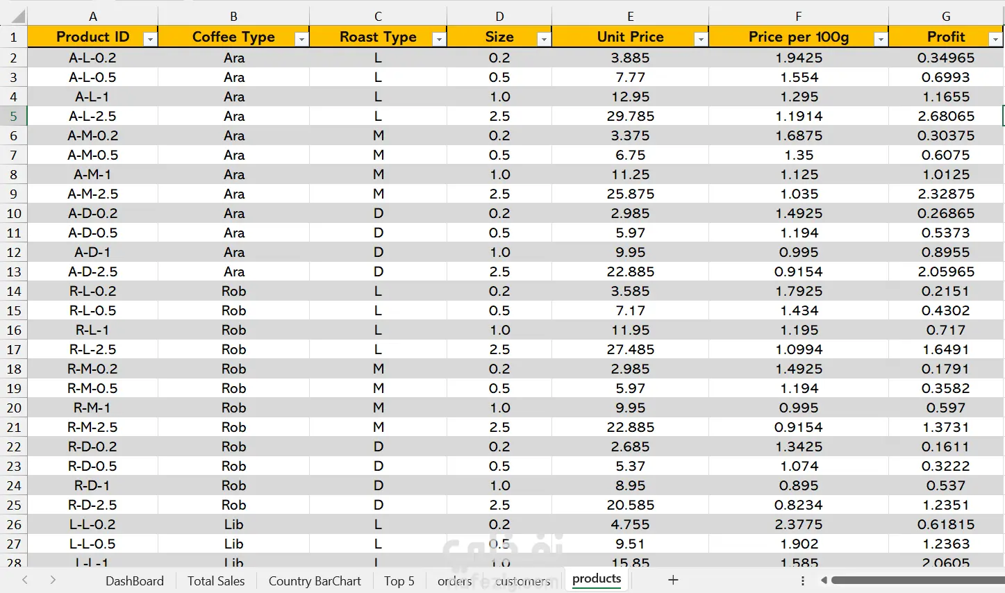 تحويل بيانات مبيعات ضخمة وغير منظمة إلى لوحة تحكم تفاعلية وشاملة باستخدام Excel. يهدف المشروع إلى تتبع أداء المبيعات عبر الزمن، وفهم تفضيلات العملاء بناءً على أنواع القهوة المختلفة (Arabica, Robusta, etc.) لمساعدة إدارة المتجر في اتخاذ قرارات تسويقية دقيقة. المميزات والخطوات التقنية: هيكلة البيانات (Data Structuring): تنظيم جداول العملاء (Customers)، المنتجات (Products)، والطلبات (Orders) لضمان سهولة الربط والتحليل. التحليل المتقدم باستخدام Pivot Tables: تلخيص آلاف السجلات لاستخراج إجمالي المبيعات السنوية والشهرية من عام 2019 حتى 2022. تصميم لوحة تحكم تفاعلية (Interactive Dashboard): استخدام Slicers للسماح للمستخدم بتصفية البيانات حسب نوع التحميص (Roast Type)، الحجم (Size)، أو حالة بطاقة الولاء (Loyalty Card). رسم بياني لمبيعات الدول (Sales By Country) يوضح أن الولايات المتحدة هي السوق الأكبر. تحديد أفضل 5 عملاء (Top 5 Customers) بناءً على إجمالي المشتريات لتسهيل استهدافهم بالعروض. استخراج الرؤى (Insights Extraction): مراقبة اتجاهات المبيعات (Trends) عبر الزمن لتحديد الأصناف الأكثر نمواً والأقل أداءً. الأدوات المستخدمة: Microsoft Excel: (Pivot Tables, Power Pivot, Slicers, Advanced Charts)