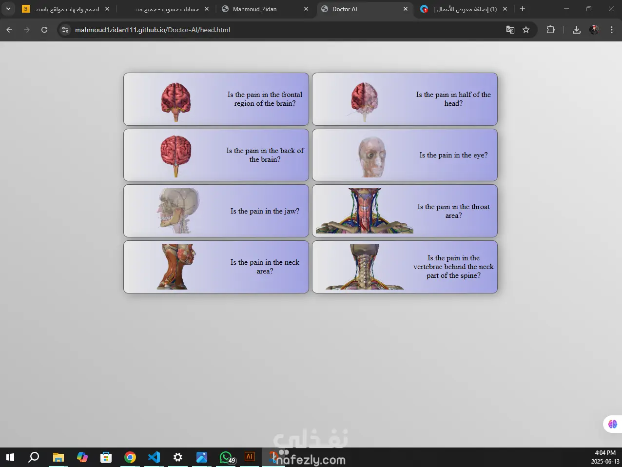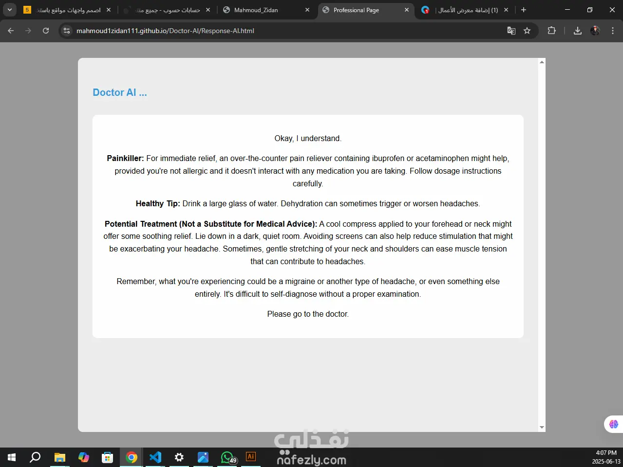 Doctor AI هو موقع ويب تفاعلي يساعد المستخدم على إدخال وصف للأعراض أو الألم الذي يشعر به، ثم يعرض له ردًا مُنظّمًا وسهل القراءة داخل الصفحة (مع تنسيق Markdown وتأثير كتابة تدريجي) لتجربة استخدام سريعة وبسيطة. ركّزت في المشروع على واجهة مستخدم واضحة، تنظيم البيانات بين الصفحات، وتحسين طريقة عرض النتائج بشكل احترافي. خطة التطوير القادمة: سيتم تطوير المنصة لتعرض للمستخدم قائمة الأطباء المشتركين شهريًا بناءً على نوع الألم/الأعراض التي يحددها، مع إنشاء نظام حجز للطبيب. عند الحجز سيصل للطبيب ملخص منظم عن حالة المريض وما يشعر به لتسهيل التشخيص والمتابعة.