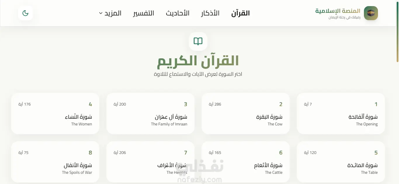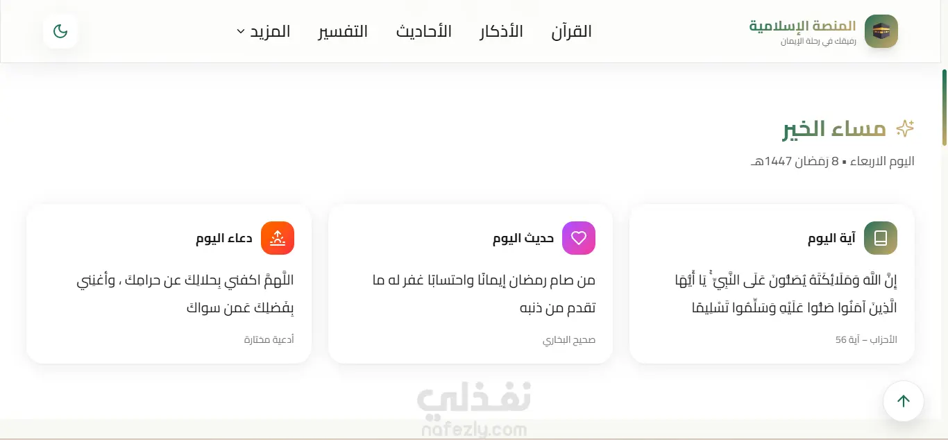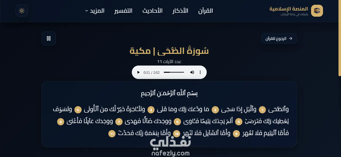 المنصة الإسلامية هي تصميم واجهة ويب تفاعلية تهدف إلى توفير تجربة روحانية متكاملة للمستخدم، تجمع بين القرآن الكريم، الأحاديث، الأذكار، التفسير، ومواقيت الصلاة في مكان واحد. المشروع عبارة عن تصميم Front-End متكامل يركز على تجربة المستخدم، الهوية البصرية الإسلامية، وسهولة الوصول للمحتوى الديني بشكل يومي.