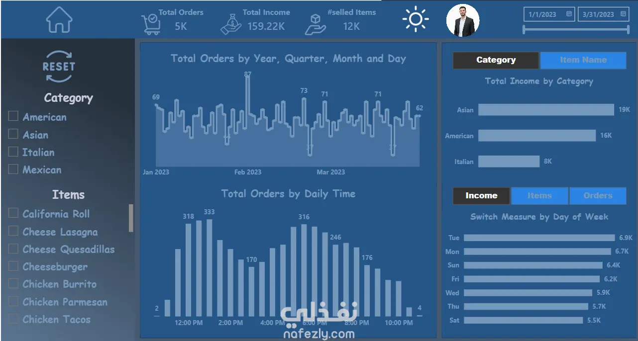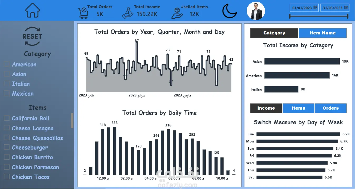 تم تصميم وتطوير هذه اللوحة باستخدام Power BI لتحليل بيانات المبيعات بشكل احترافي وتفاعلي، مع تصميم الواجهة وتجربة المستخدم مسبقًا باستخدام Figma لضمان شكل عصري وسهل الاستخدام. تهدف اللوحة إلى مساعدة أصحاب الأعمال على فهم الأداء واتخاذ قرارات مبنية على البيانات. ? المؤشرات الرئيسية (KPIs): - إجمالي عدد الطلبات - إجمالي الدخل - عدد المنتجات المباعة ? تحليل زمني متكامل: - عرض إجمالي الطلبات حسب السنة والربع والشهر واليوم - تحليل الطلبات حسب أوقات اليوم لتحديد ساعات الذروة ? تحليل حسب الفئة والمنتج: - إجمالي الدخل حسب التصنيف (Category) - إمكانية التبديل بين عرض الفئات وأسماء المنتجات - مقارنة بين الدخل، عدد العناصر، وعدد الطلبات ? تحليل حسب أيام الأسبوع: - قياس الأداء اليومي لتحديد أكثر الأيام تحقيقًا للإيرادات ? المميزات الإضافية: - تصميم واجهة احترافي تم تنفيذه باستخدام Figma قبل التطوير - فلاتر تفاعلية حسب التصنيف والمنتج - تحديد نطاق زمني مخصص - زر Reset لإعادة ضبط جميع الفلاتر - تجربة مستخدم واضحة وسهلة القراءة هذه اللوحة مناسبة للمطاعم، المتاجر، أو أي نشاط يعتمد على تحليل المبيعات، وتساعد في: ✔ تحديد أفضل المنتجات مبيعًا ✔ معرفة أوقات الذروة ✔ تحليل أداء الفئات المختلفة ✔ تحسين استراتيجيات التسعير والمبيعات