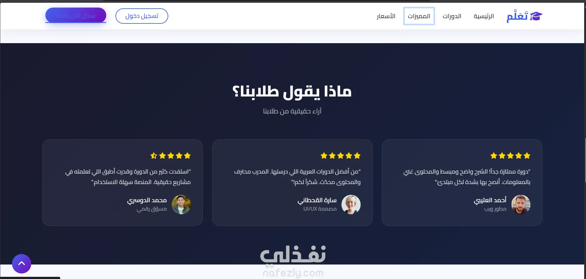 قمت بتصميم وتطوير صفحة هبوط (Landing Page) احترافية وعصرية لمنصة تعليمية لعرض وبيع الدورات التدريبية أونلاين. ? مميزات الصفحة: ✅ تصميم عصري وجذاب يشد انتباه الزائر من أول ثانية ✅ متوافقة مع جميع الأجهزة (موبايل - تابلت - كمبيوتر) ✅ دعم كامل للغة العربية واتجاه RTL ✅ تأثيرات حركية سلسة عند التمرير (Scroll Animations) ✅ قسم Hero Section بتصميم ملفت مع إحصائيات متحركة ✅ قسم عرض الدورات المتاحة ببطاقات تفاعلية ✅ قسم مميزات المنصة ✅ قسم آراء وتقييمات الطلاب ✅ قسم خطط الأسعار ✅ قسم الدعوة للتسجيل (CTA) ✅ Footer شامل بمعلومات التواصل والروابط ✅ زر العودة للأعلى ✅ Navbar شفاف يتغير عند التمرير ✅ سرعة تحميل عالية وأداء ممتاز ?️ التقنيات المستخدمة: • HTML5 • CSS3 (Flexbox, Grid, Animations, Gradients) • JavaScript (Vanilla JS) • Bootstrap 5 RTL • مكتبة AOS للتأثيرات الحركية • Font Awesome للأيقونات • Google Fonts (خط Cairo العربي)