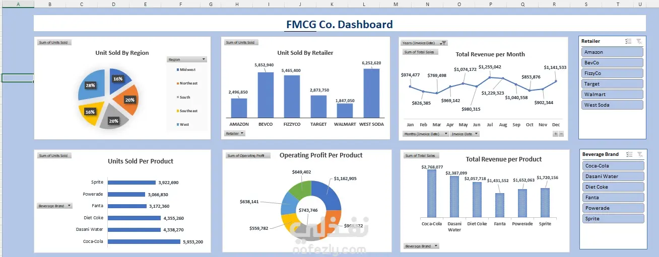 Dashboard تفاعلي لتحليل المبيعات في شركة في قطاع FMCG، يوضح الأداء حسب المنطقة، المنتج، والتاجر. يساعد على تتبع الإيرادات، الأرباح، واتخاذ قرارات مبنية على البيانات بسهولة.