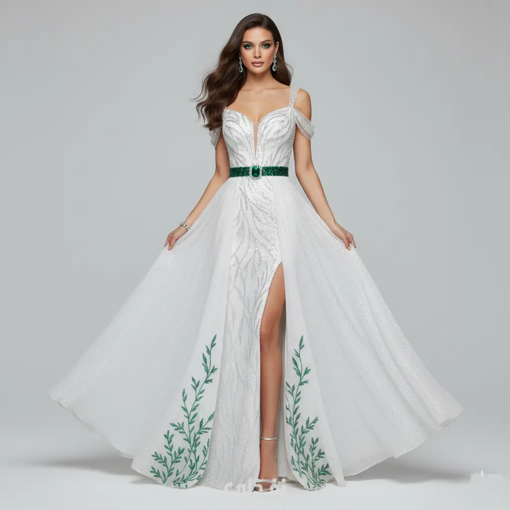 فستان سهرة فاخر بتصميم فريد بالأبيض المرصع وأوراق الشجر الخضراء المطرزة على الفستان مستوحى من فصل الربيع