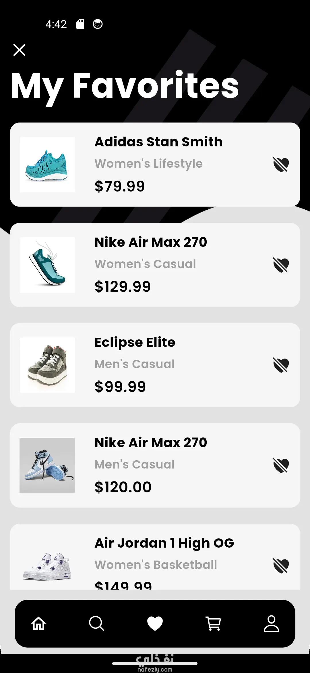 ميزة "المفضلة" التي تسمح للمستخدمين بحفظ الأحذية التي نالت إعجابهم للرجوع إليها لاحقاً، مما يساعد في اتخاذ قرار شراء مدروس وتتبع توفر المنتج.