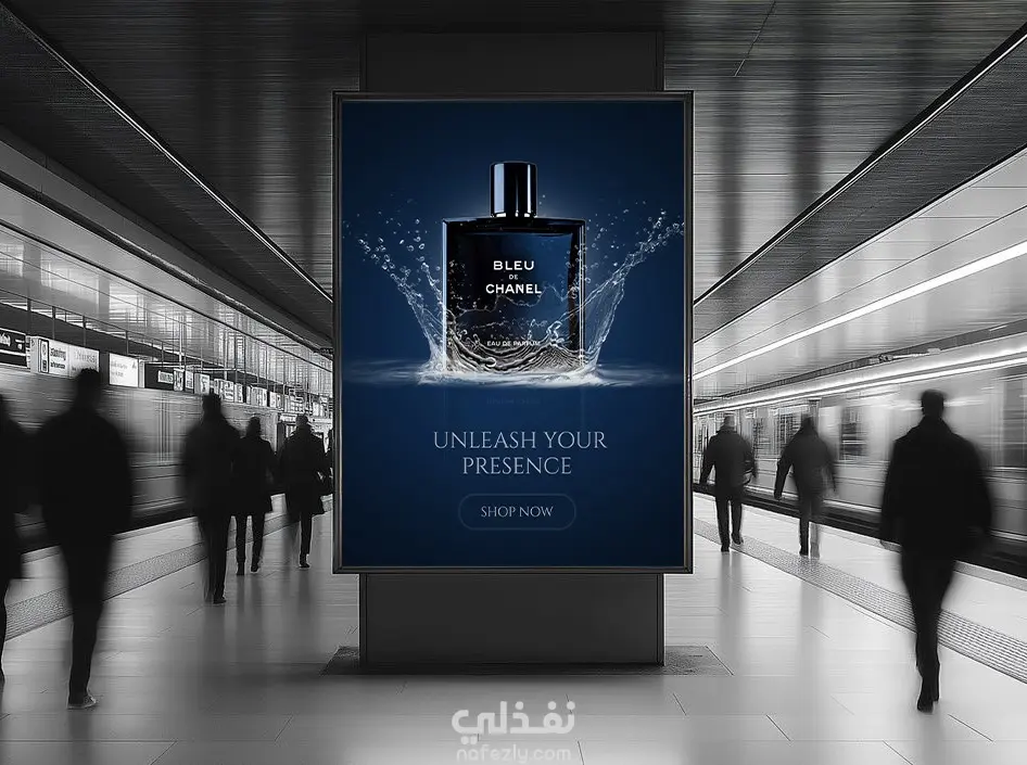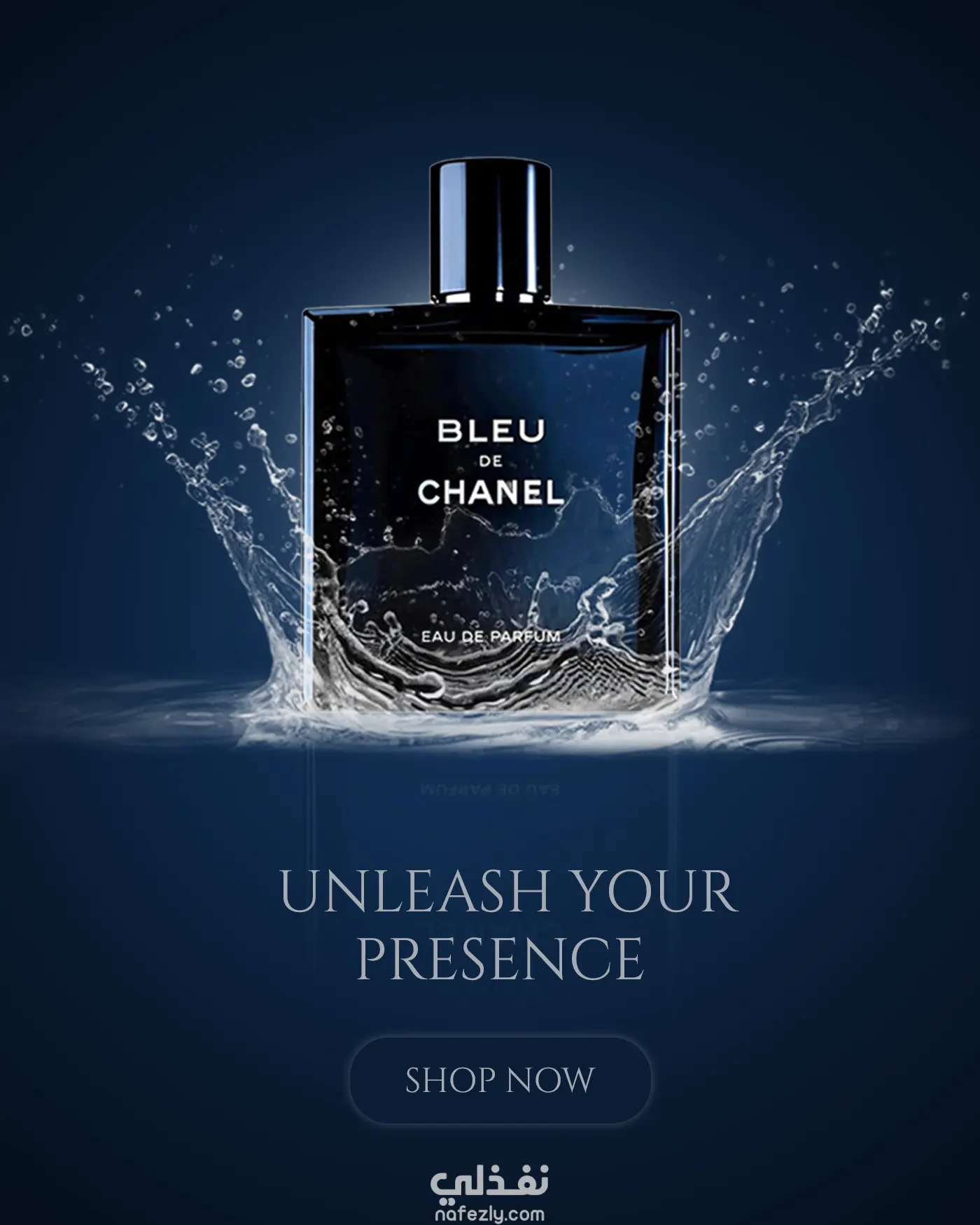 تصميم إعلاني بصري فاخر لعطر BLEU DE CHANEL يعكس القوة والثقة والأناقة. يجمع التصميم بين زجاجة العطر وتأثيرات مائية ديناميكية لإبراز إحساس بالانتعاش والطاقة.