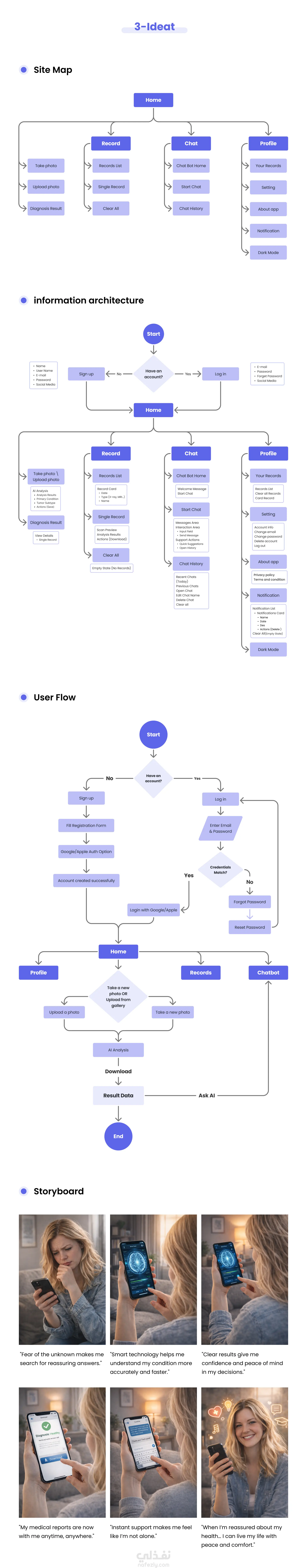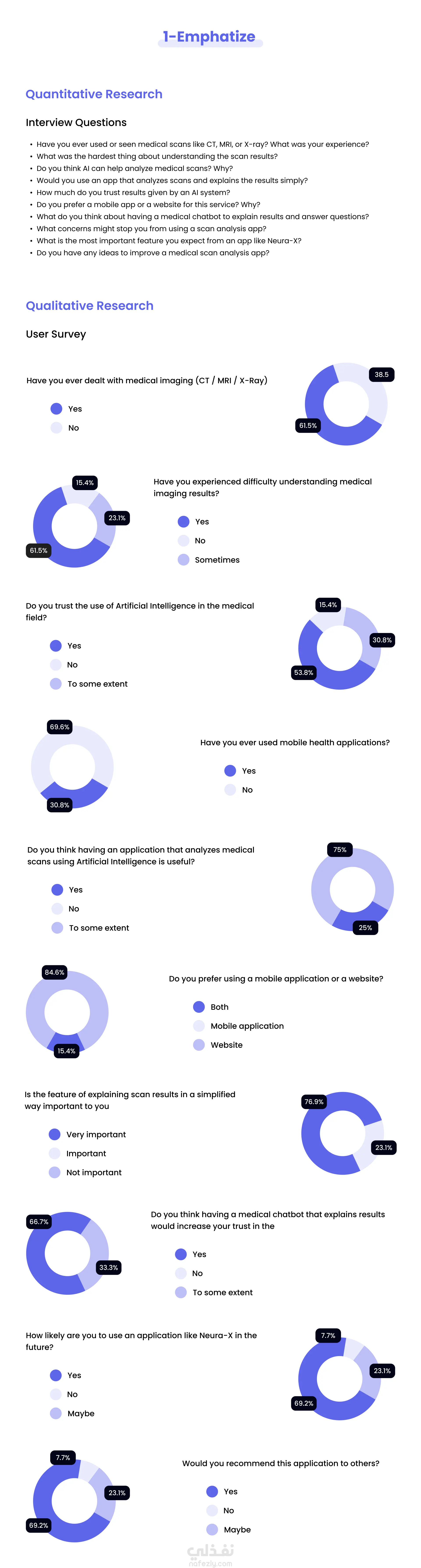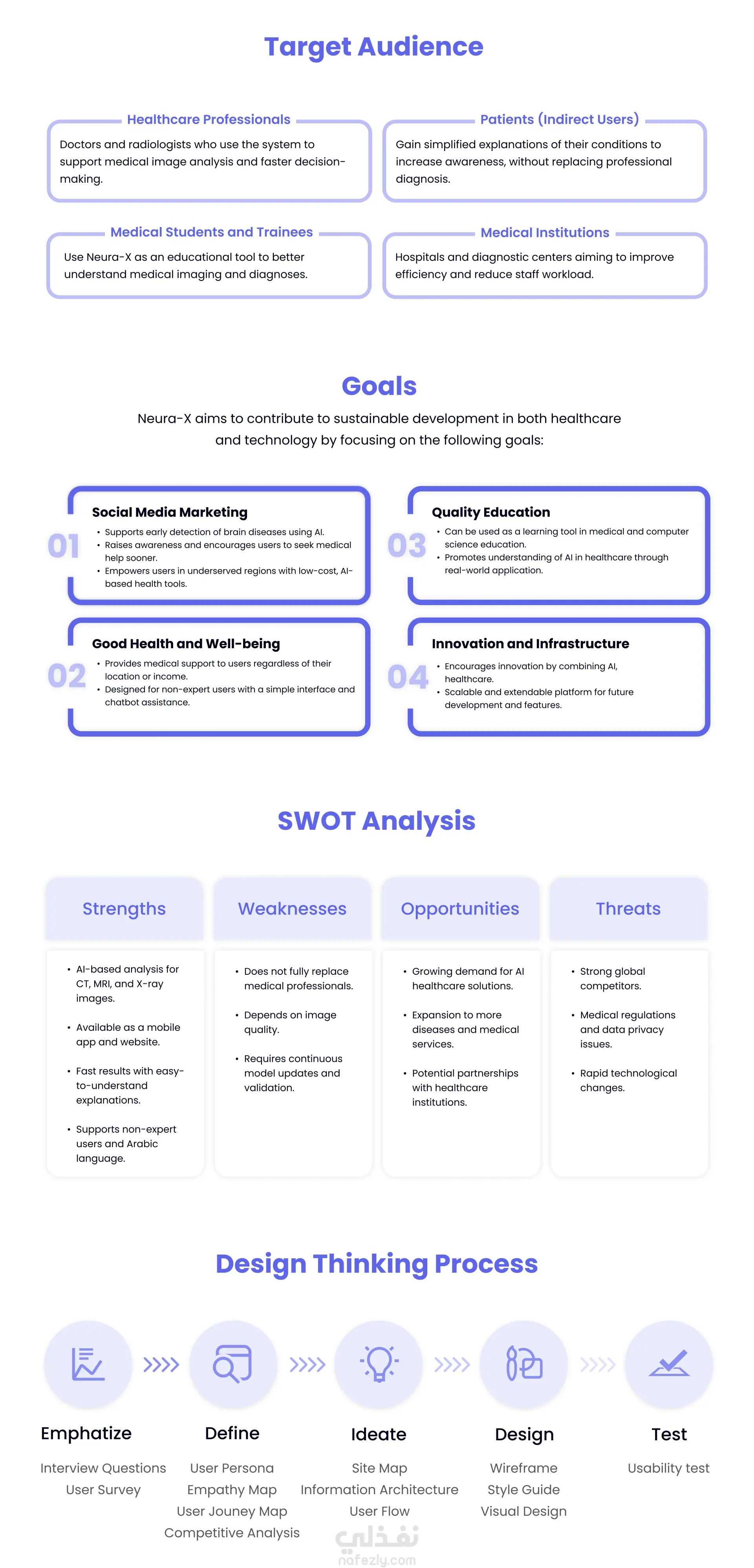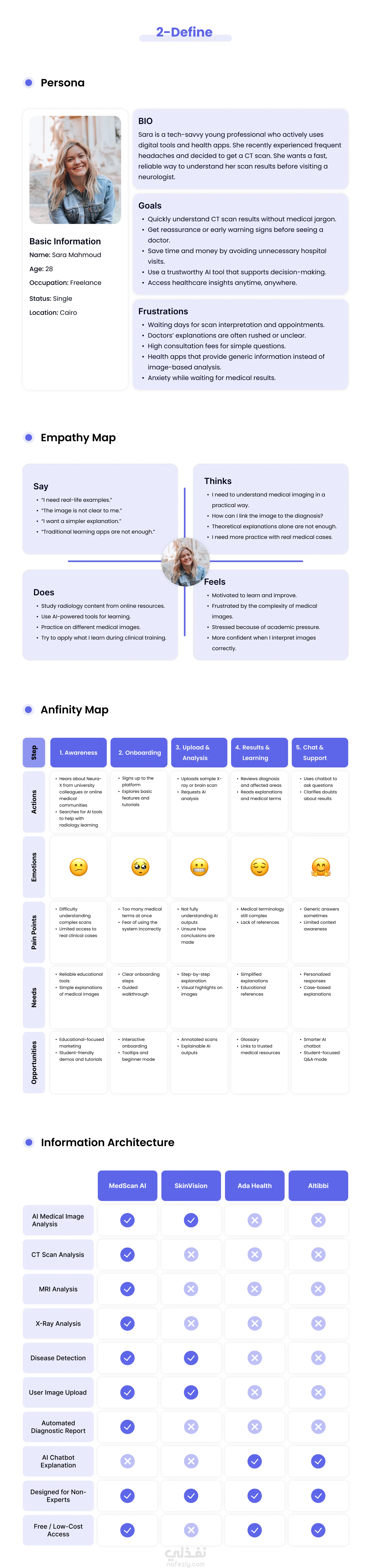 Neura-X هو تطبيق موبايل مدعوم بالذكاء الاصطناعي يهدف إلى جعل تحليل الصور الطبية أكثر سهولة وإتاحة للطلاب، وغير المتخصصين، والمرضى. يتيح التطبيق للمستخدمين رفع صور الأشعة الطبية، والحصول على تحليلات مدعومة بالذكاء الاصطناعي، وفهم النتائج المعقدة من خلال شروحات واضحة وإرشاد تفاعلي. تعرض دراسة الحالة هذه العملية الكاملة لتصميم تجربة وواجهة المستخدم (UX/UI)، بدءًا من بحث المستخدمين، ورسم رحلة المستخدم، وإنشاء الـ Storyboard، مرورًا بالـ Wireframes، وصولًا إلى التصميم البصري النهائي. كان الهدف هو إنشاء واجهة نظيفة وبديهية تربط بين التكنولوجيا الطبية المتقدمة والمستخدمين العاديين بطريقة بسيطة وسلسة.