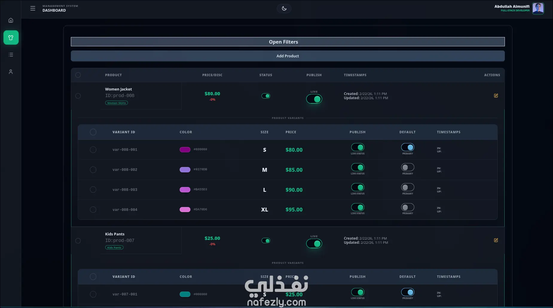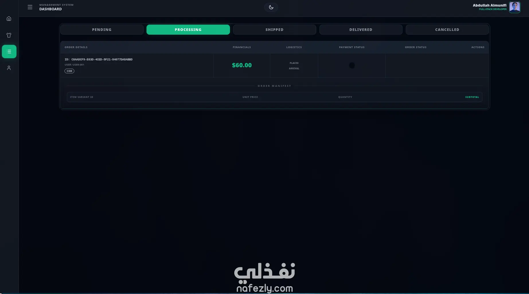 - عرض الملابس مع اختيار المقاسات والألوان - عرض تفاصيل عربة التسوق - عرض الطلبات Pending - Preparing - Shipped - Delivered - Cancelled - طلب استرجاع بعد الاستلام - الدفع نقدا او عن طريق Stripe ------------------------------------------- - لوحة تحكم Dashboard - ادارة المنتاجات - متابعة الطلبات - الموافقة او الرفض علي طلبات الاسترجاع