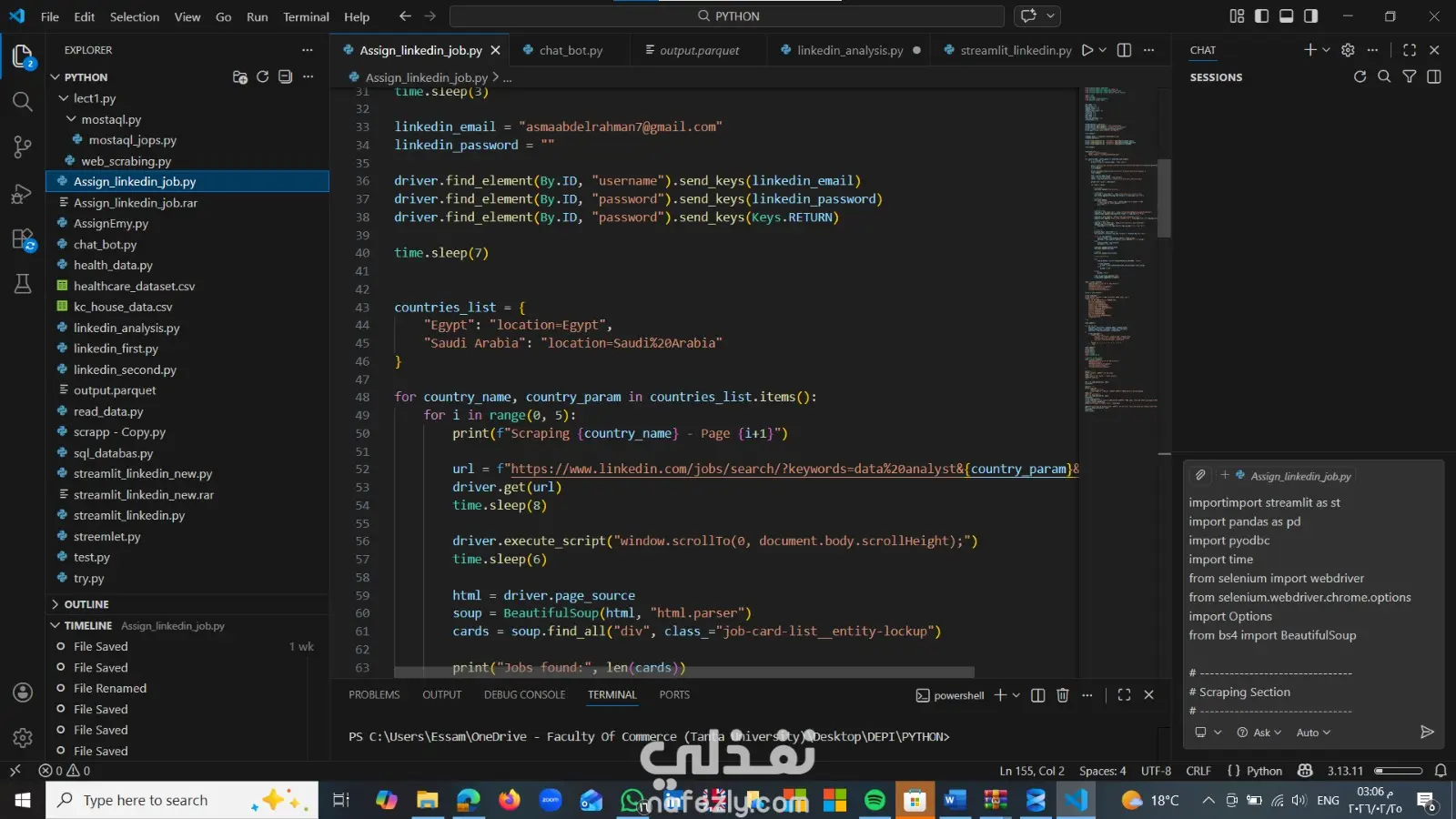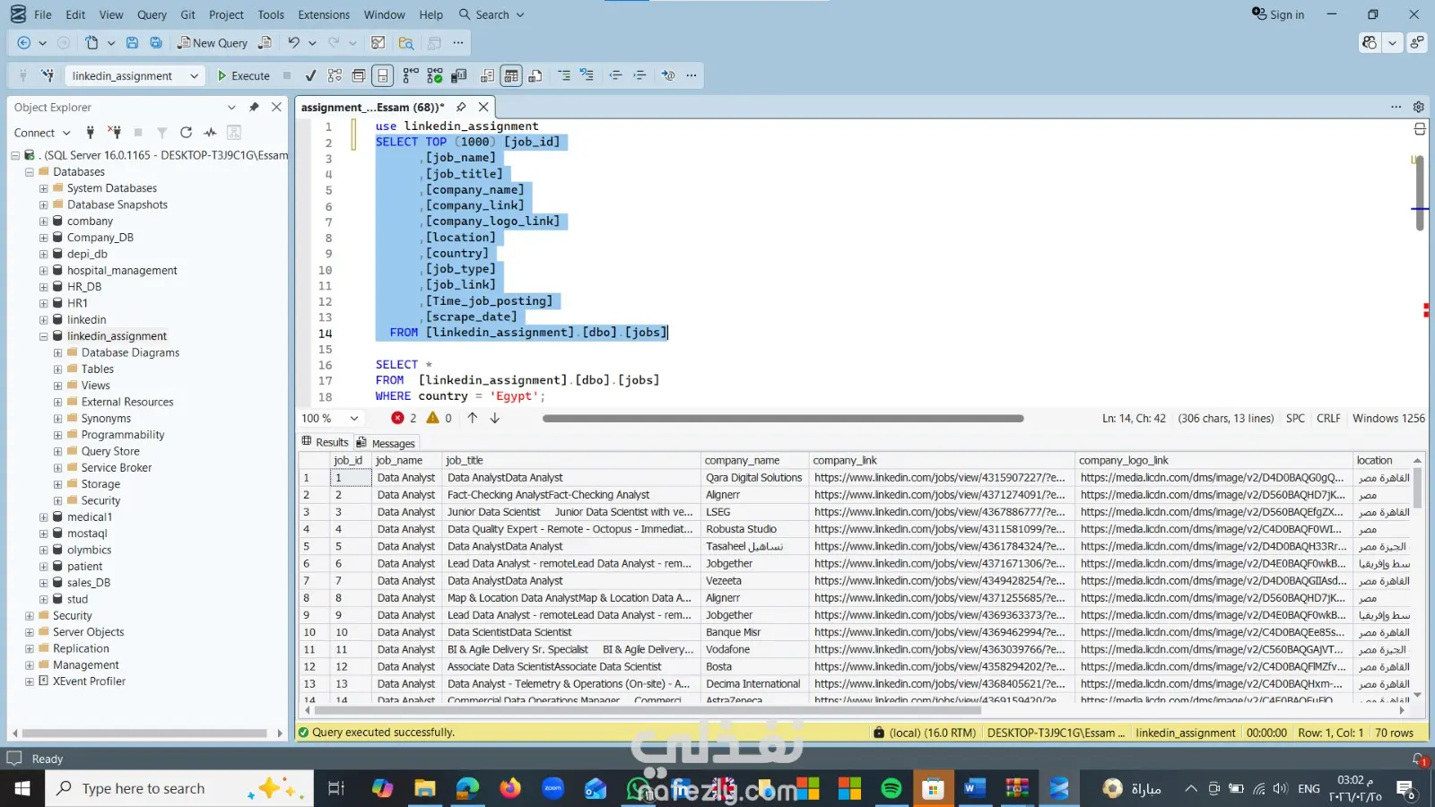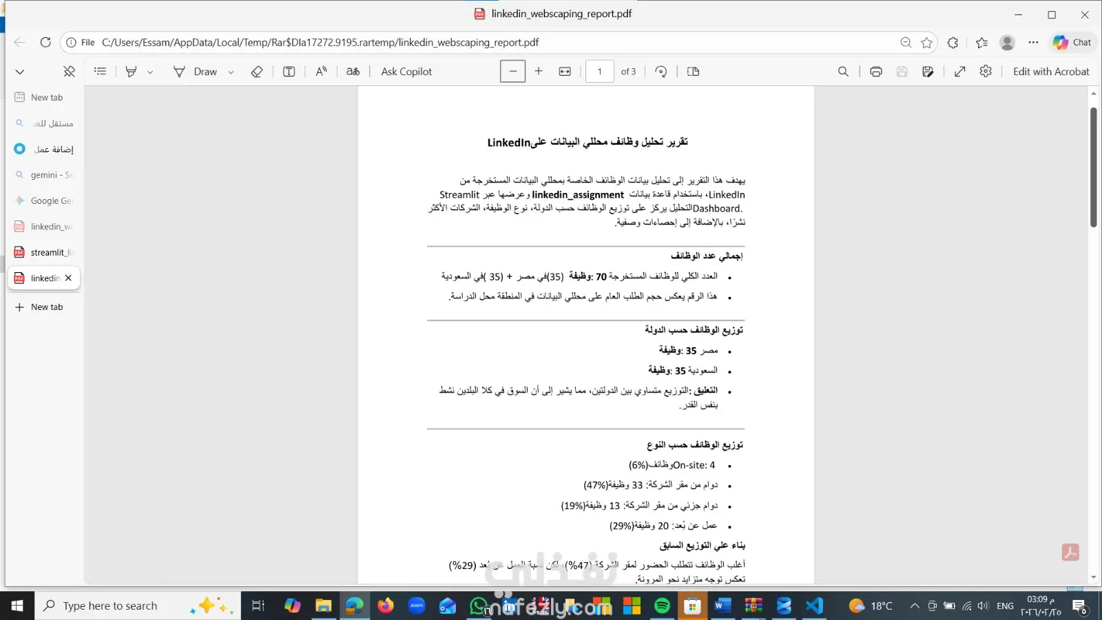 قمت بالتعاون مع فريقي التقني بتنفيذ مشروع متكامل لتحليل سوق العمل الخاص بمحللي البيانات (Data Analysts) في أكبر سوقين بالمنطقة العربية (مصر والسعودية). هدف المشروع هو تقديم رؤى تحليلية مبنية على البيانات لمساعدة الباحثين عن عمل وأصحاب القرار في فهم اتجاهات التوظيف الحالية. مر المشروع بعدة مراحل تقنية احترافية: جمع البيانات (Web Scraping): استخراج بيانات الوظائف الحية من منصة LinkedIn بدقة، مع التركيز على المسميات الوظيفية، المواقع الجغرافية، ونمط العمل. إدارة قواعد البيانات (SQL): بناء قاعدة بيانات منظمة وتصميم استعلامات (Queries) معقدة لتنظيف البيانات وتصنيفها وتحضيرها للتحليل. التحليل الإحصائي: إجراء تحليل إحصائي وصفي شامل لفهم توزيع الوظائف، وقياس التشتت (Standard Deviation) والمتوسطات، لتحديد مدى تباين الفرص بين أنماط العمل المختلفة. العرض التفاعلي (Streamlit Dashboard): تطوير لوحة تحكم تفاعلية باستخدام مكتبة Streamlit لعرض النتائج عبر رسوم بيانية (Visuals) توضح: توزيع الوظائف جغرافياً بين مصر والسعودية. تحليل أنماط العمل (عن بُعد، من مقر الشركة، دوام جزئي). قائمة الشركات الأكثر نشاطاً في التوظيف. أبرز نتائج التحليل: توازن السوق: وجدنا توازناً دقيقاً في عدد الفرص بين مصر والسعودية بنسبة (50% لكل منهما)، مما يعكس نشاطاً متساوياً في التحول الرقمي. مرونة العمل: رصدنا توجهاً ملحوظاً نحو العمل عن بُعد بنسبة تقترب من 29%، رغم سيطرة العمل الميداني بنسبة 47%. نشاط الشركات: تحديد الشركات القائدة في سوق التوظيف مثل Jobgether و Master Works. الأدوات والتقنيات المستخدمة: Python: (Scraping & Data Processing). SQL: (Database Management & Querying). Streamlit: (Interactive Dashboarding). Statistics: (Descriptive Analysis, Standard Deviation, Means).