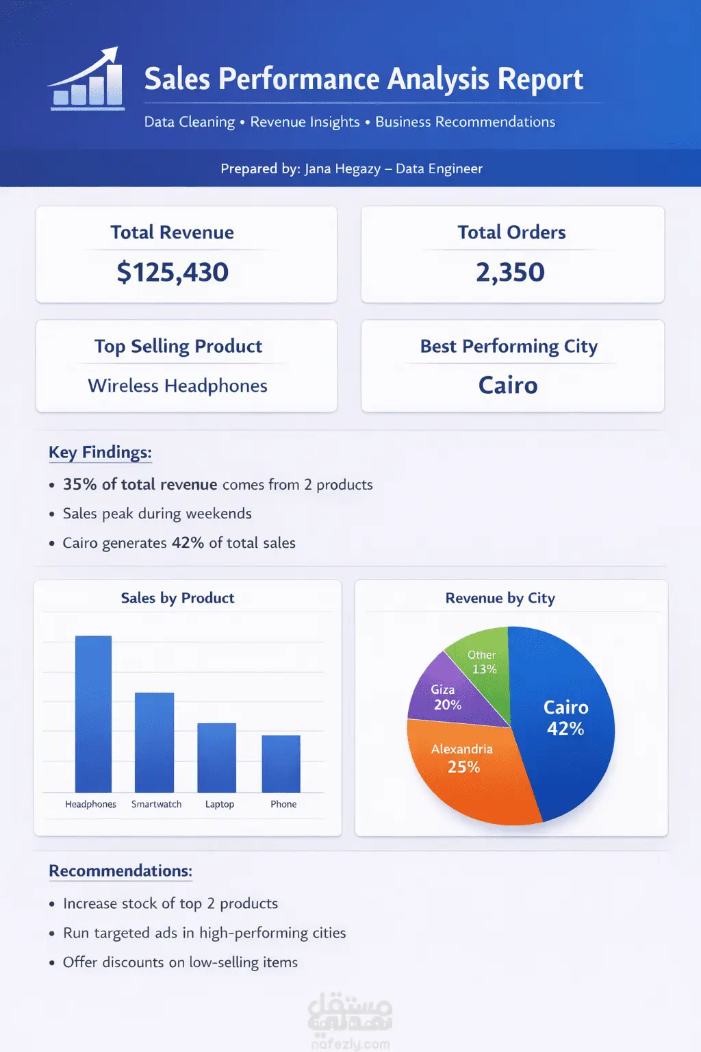 يوضح هذا المشروع سير عمل متكامل لتحليل بيانات المبيعات، بدءًا من البيانات الخام وصولًا إلى استخلاص رؤى عملية قابلة للتنفيذ في مجال الأعمال. قمت بتنظيف البيانات ومعالجتها مسبقًا، بالإضافة إلى تحليل الإيرادات لاستخراج مؤشرات أداء ذات معنى. يتضمن التقرير ما يلي: حساب إجمالي الإيرادات وإجمالي عدد الطلبات تحديد المنتج الأكثر مبيعًا تحليل أفضل مدينة من حيث الأداء توزيع المبيعات حسب المنتج تفصيل الإيرادات حسب الموقع الجغرافي تقديم توصيات تجارية واضحة مبنية على النتائج المستخلصة المخرج النهائي هو تقرير احترافي بأسلوب لوحة تحكم (Dashboard) مصمم لمساعدة أصحاب الأعمال على اتخاذ قرارات قائمة على البيانات، وتحسين إدارة المخزون، وتطوير استراتيجيات التسويق.