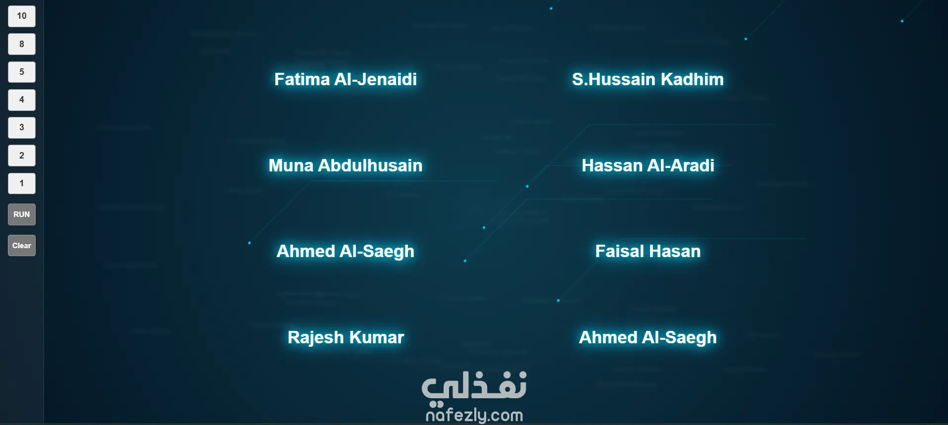 هذا المشروع عبارة عن تطبيق ويب تفاعلي مُصمم لإجراء سحوبات عشوائية بطريقة بصرية جذابة. يتميز النظام بالآتي: واجهة مستخدم عصرية: تصميم مستوحى من الطابع التقني (Cyber/Tech) مع خلفية متحركة تم إنشاؤها باستخدام Canvas API. تخصيص كامل: إمكانية تحديد عدد الفائزين (من 1 إلى 10) بضغطة زر واحدة. خوارزمية توزيع ذكية: عند اختيار الفائزين، يقوم النظام بإعادة ترتيب الأسماء المختارة تلقائياً في منتصف الشاشة باستخدام نظام شبكي (Grid) يمنع التداخل، مع تطبيق تأثيرات إضاءة (Glow) وتعتيم (Dimming) لبقية الأسماء لزيادة الحماس. تجربة مستخدم سلسة: استخدام تحويلات CSS الانتقالية (Transitions) لضمان حركة انسيابية للأسماء من مواقعها العشوائية إلى منصة التتويج. تصميم متجاوب: يتفاعل الكانفس والعناصر مع تغيير حجم الشاشة لضمان أداء ثابت على مختلف الأجهزة.