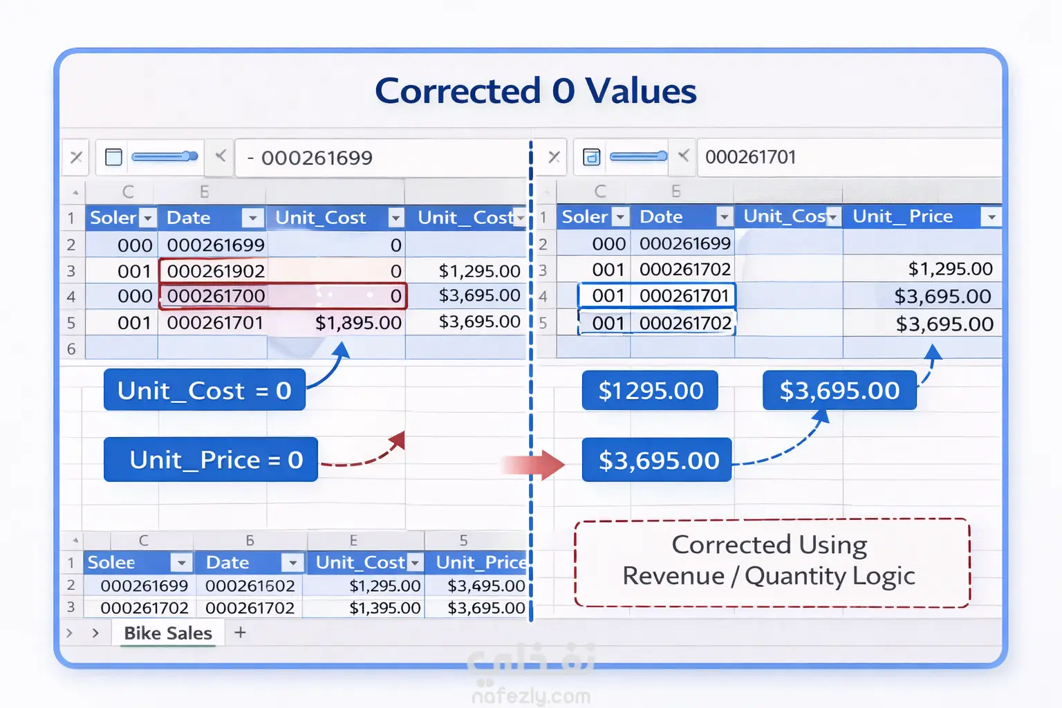 تم اكتشاف قيم صفرية غير منطقية في أعمدة التكلفة وسعر الوحدة رغم وجود مبيعات وأرباح.