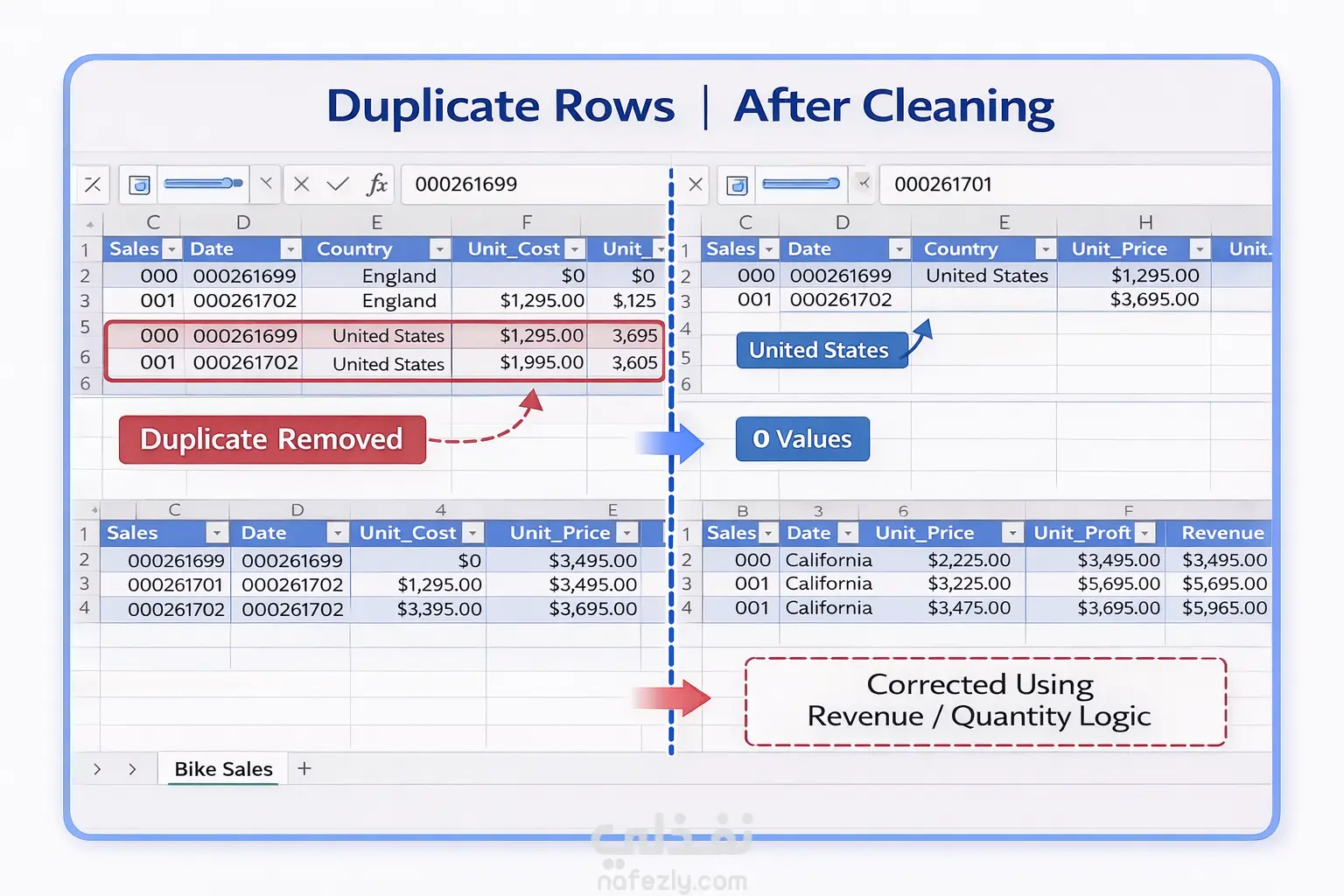 قمت بتنظيف ومعالجة ملف مبيعات يحتوي على أخطاء منطقية وحسابية لضمان دقة التقارير ولوحات التحكم (Dashboards).