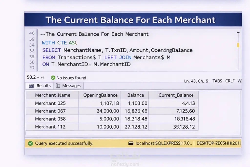 تم احتساب Current Balance لكل تاجر باستخدام عمليات تجميع SUM وربط الجداول.