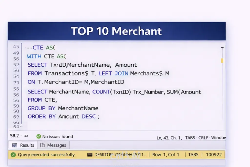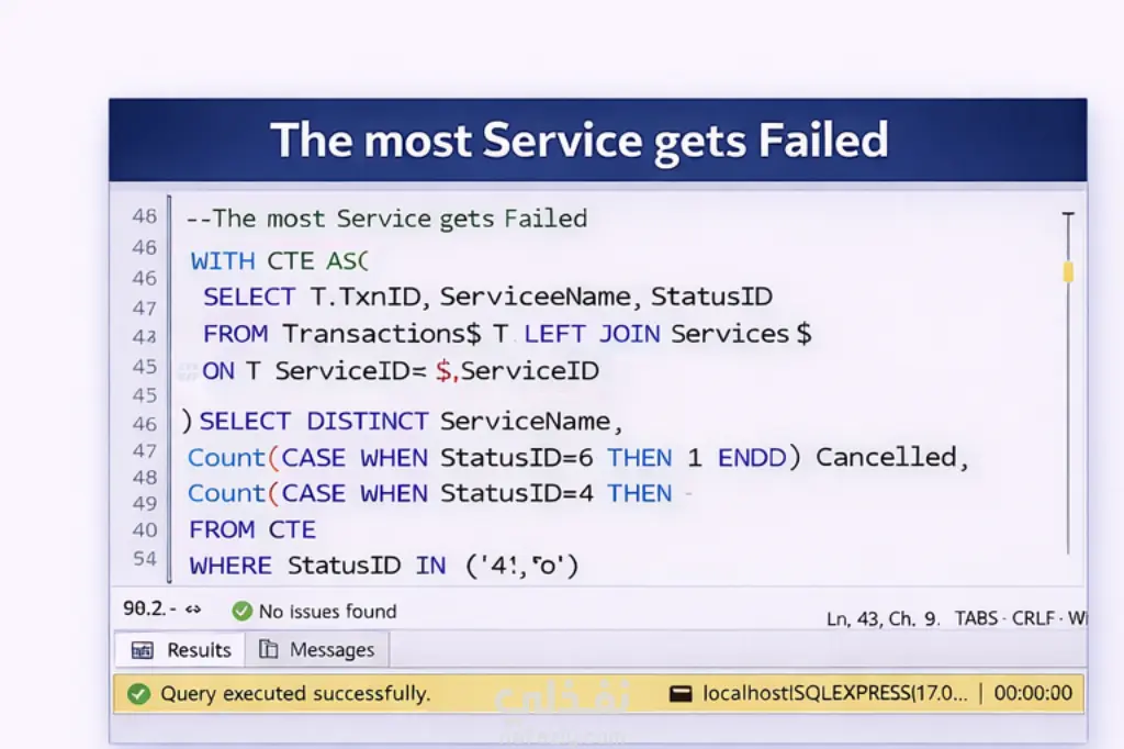 قمت بتحليل بيانات معاملات نظام خدمات باستخدام SQL Server لاستخراج مؤشرات أداء رئيسية (KPIs) تساعد في فهم أداء النظام، التجار، والخدمات المختلفة.