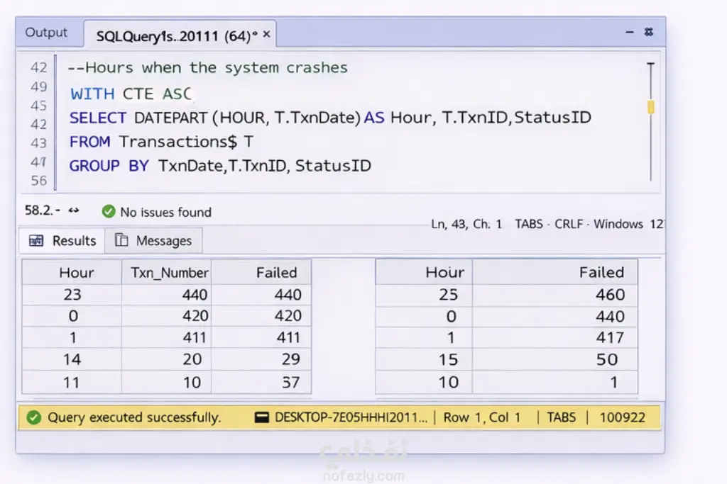 تم تحديد أكثر الساعات التي يحدث فيها فشل في المعاملات لتحديد أوقات الضغط أو الأعطال.