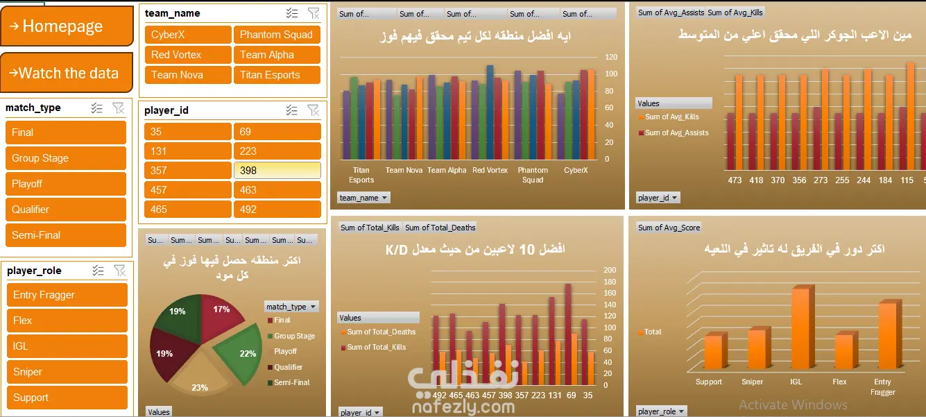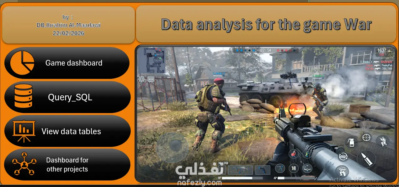 دور SQL في المشروع (استخراج وتجهيز البيانات) في ألعاب الحرب، تكون البيانات ضخمة (الملايين من سجلات المعارك)، وهنا يأتي دور SQL: Queries المستخدمة: كتابة استعلامات لاستخراج بيانات محددة مثل (أكثر الأسلحة استخداماً، معدل القتل/الموت لكل لاعب K/D Ratio، ترتيب التحالفات). Data Aggregation: تجميع البيانات حسب "المستوى" أو "الخريطة" لمعرفة أي المناطق تشهد أكثر الصراعات. Joins: ربط جداول اللاعبين بجداول المعارك والمشتريات داخل اللعبة (In-game purchases) لفهم سلوك اللاعبين "الحيتان" (Whales). دور Excel في المشروع (التحليل البصري والداشبورد) بعد استخراج البيانات المنظمة من SQL، يتم نقلها للإكسيل لعمل الآتي: Interactive Dashboard: تصميم لوحة تحكم تفاعلية تسمح لمدير اللعبة أو المحلل باختيار "فترة زمنية" أو "سيرفر معين" لمراقبة الأداء. Trend Analysis: رسم بياني يوضح أوقات الذروة (أكثر الساعات التي تشهد حروباً ونشاطاً). Heat Maps: استخدام خرائط حرارية بسيطة داخل الإكسيل لتوضيح الدول أو المناطق الأكثر نشاطاً في اللعبة. KPIs: عرض مؤشرات الأداء الرئيسية مثل: Retention Rate: نسبة اللاعبين المستمرين بعد أول حرب. Win/Loss Ratio: تحليل التوازن في اللعبة (Game Balancing). 4. هيكل البيانات (Data Schema) الذي عملت عليه: يمكنك الإشارة إلى الجداول التي حللتها: Players_Table: معلومات اللاعبين، المستويات، والدول. Matches_Table: تفاصيل كل معركة (التوقيت، المدة، الخريطة). Equipment_Table: الأسلحة والمعدات المستخدمة وفعالية كل منها. 5. القيمة المضافة (ماذا يستفيد العميل؟) تحسين التوازن: معرفة ما إذا كان هناك سلاح "قوي بزيادة" يحتاج لإضعاف (Nerf). زيادة الأرباح: فهم العلاقة بين المشاركة في الحروب وبين عمليات الشراء داخل اللعبة. تجربة المستخدم: تحديد الخرائط المملة التي يهجرها اللاعبون لتحسينها.