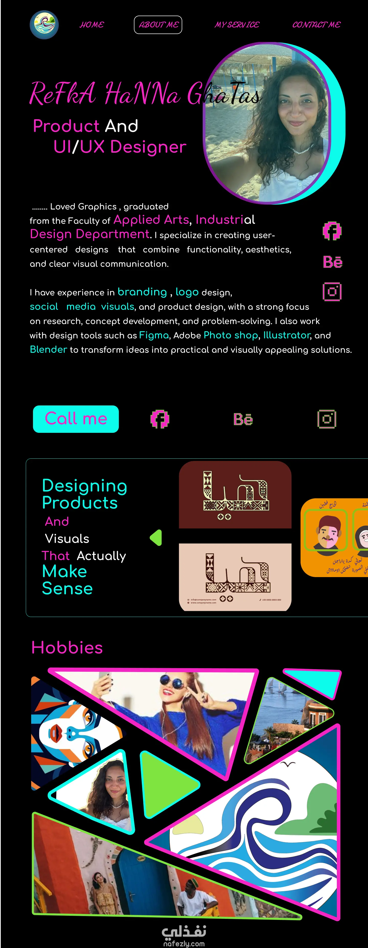 قمتُ بتصميم موقع بورتفوليو شخصي يعكس هويتي كمصممة Product & UI/UX، ويعرض خبراتي وأعمالي بأسلوب بصري جريء وعصري يجمع بين الإبداع وسهولة الاستخدام. الهدف من التصميم هو تقديم تجربة مستخدم جذابة وبسيطة، تُبرز: شخصيتي كمصممة مهاراتي المتنوعة أعمالي السابقة اهتماماتي وهواياتي وذلك من خلال واجهة تفاعلية ذات طابع بصري مميز. منهجية التصميم تنظيم المحتوى بطريقة واضحة وسلسة تسلسل بصري يوجّه المستخدم بسهولة داخل الصفحة استخدام ألوان Neon مع خلفية داكنة لإبراز العناصر المهمة Typography تعكس الطابع الإبداعي والحديث مميزات التصميم Landing Page واضحة وقوية قسم About Me يعرض الخلفية والخبرة عرض الأعمال (Projects Showcase) CTA واضح للتواصل تصميم Responsive قابل للتطوير أسلوب بصري فريد (Geometric shapes + neon colors) الأدوات المستخدمة Figma (UI Design) Adobe Photoshop & Illustrator (Visual assets) مراعاة جاهزية التصميم للتنفيذ البرمجي