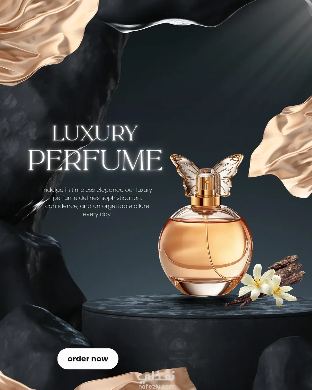 نشاء تصميم تسويقي لعطر نسائي يعبر عن الأنوثة والرقي باستخدام ألوان ناعمة وإضاءة فاخرة لإبراز إحساس الفخامة والجاذبية.