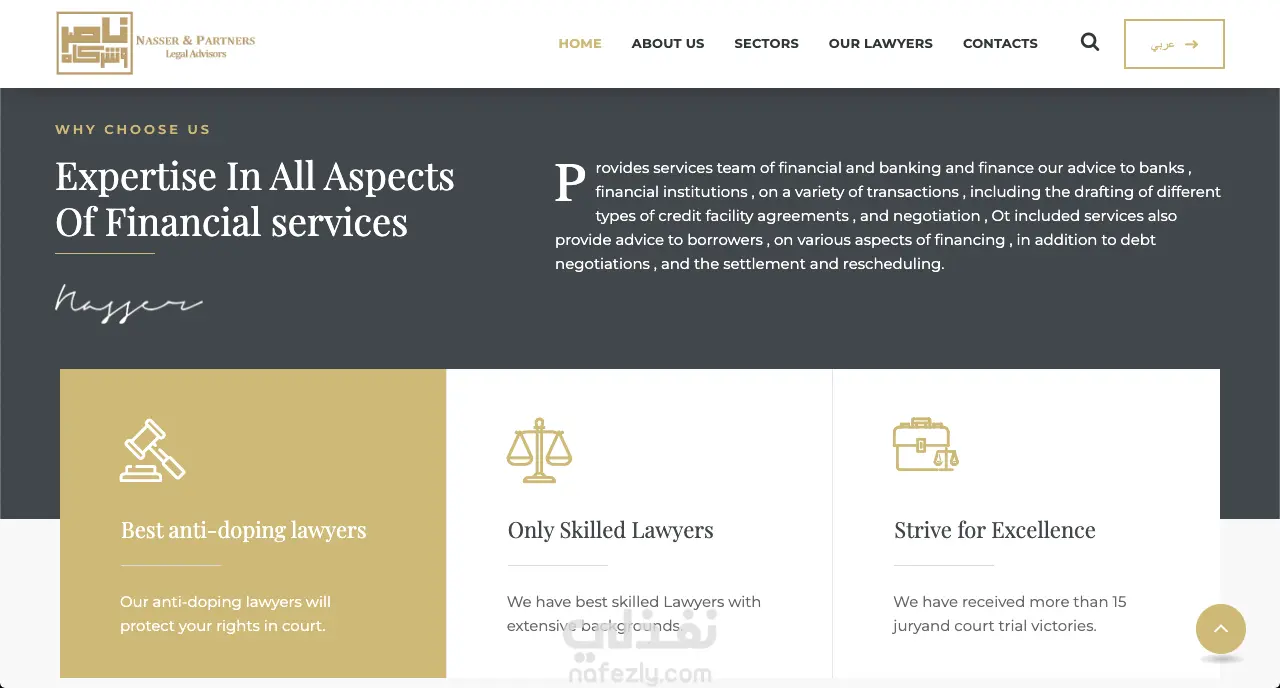 دوري في المشروع: تطوير موقع المكتب ولوحة تحكم لإدارة الخدمات والمحتوى القانوني، وتحسين تجربة المستخدم، وبناء نظام إدارة داخلي مع دعم قواعد البيانات بالووردبريس وتهيئة الموقع للأداء والاستقرار.