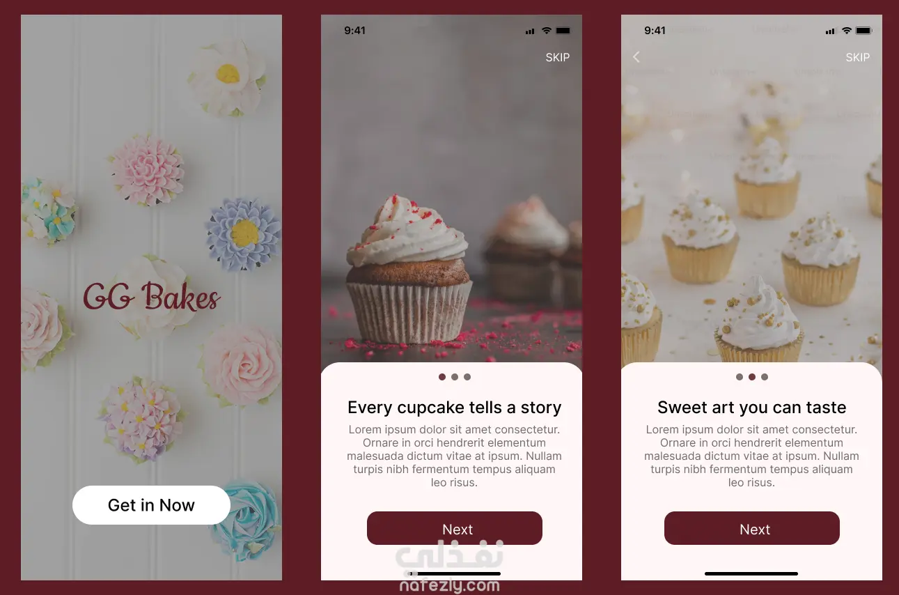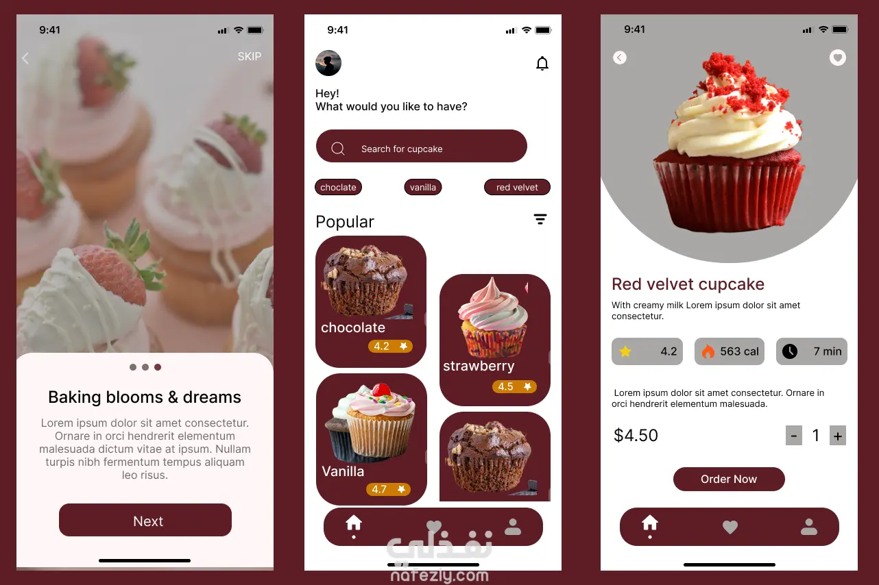 مشروع تصميم واجهات وتجربة مستخدم لتطبيق متجر حلويات متخصص في بيع الكب كيك والمنتجات المخبوزة.