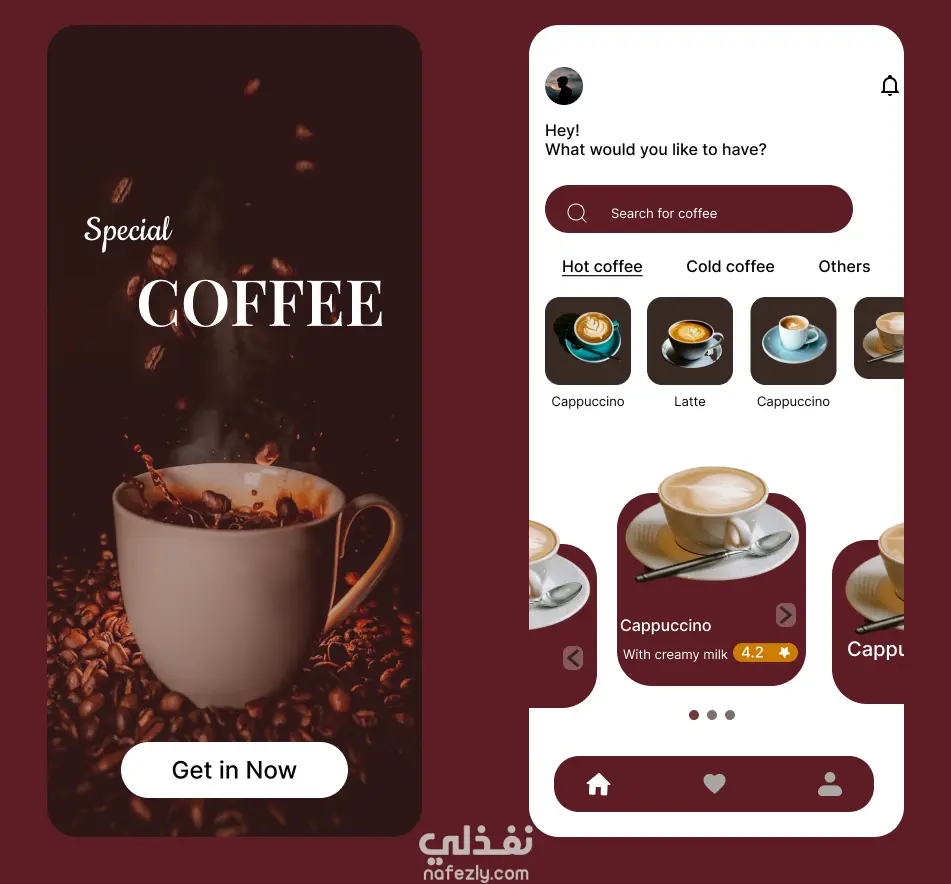 هذا نموذج لتصميم واجهة تطبيق موبايل لكافيه، يركز على تقديم تجربة مستخدم سلسة وبسيطة مع هوية بصرية دافئة مستوحاة من ألوان القهوة.