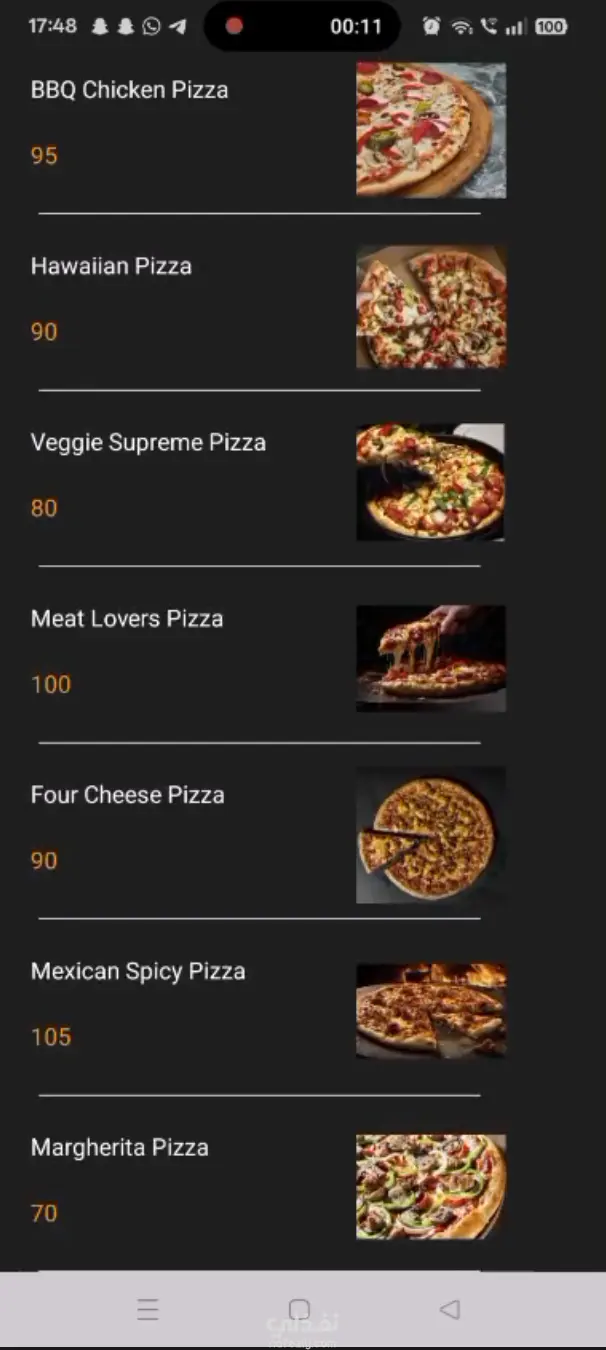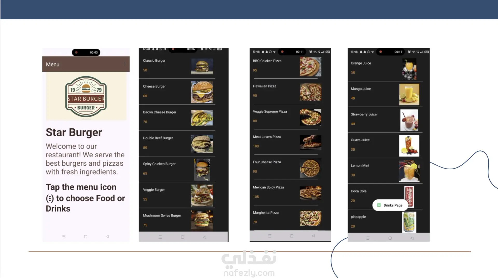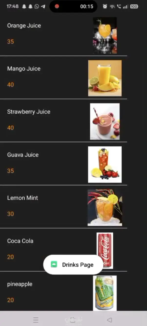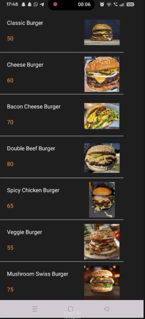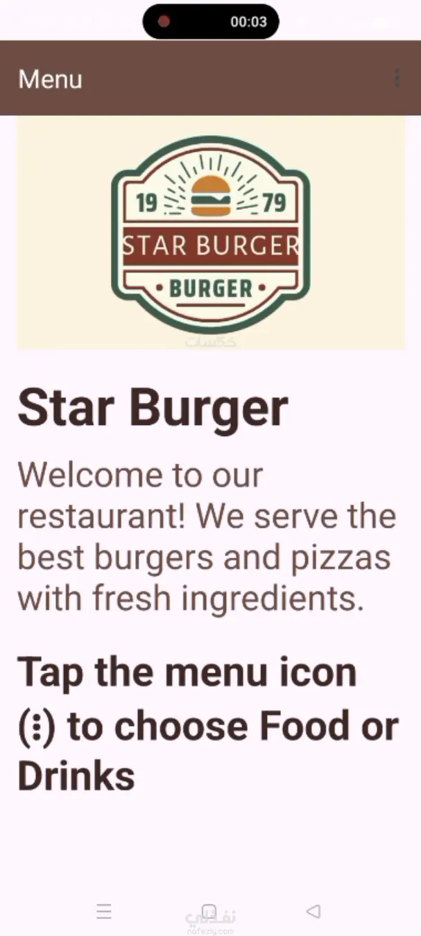 تطبيق أندرويد بسيط يعرض قوائم الأطعمة والمشروبات مع الصور والأسعار. يستخدم RecyclerView لعرض عناصر (برجر، بيتزا، عصائر). التطبيق يحتوي على Toolbar مع قائمة منسدلة للتنقل بين الأقسام والخروج، ويتميز بواجهة نظيفة وألوان متناسقة، ويعمل بالكامل بدون اتصال بالإنترنت.
