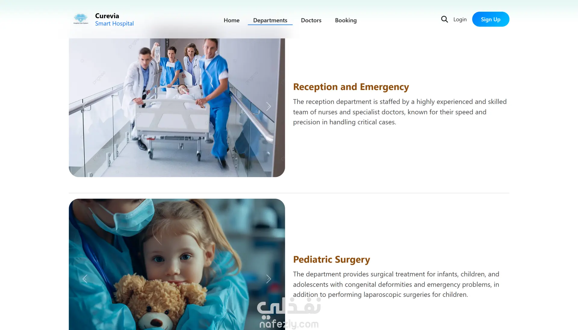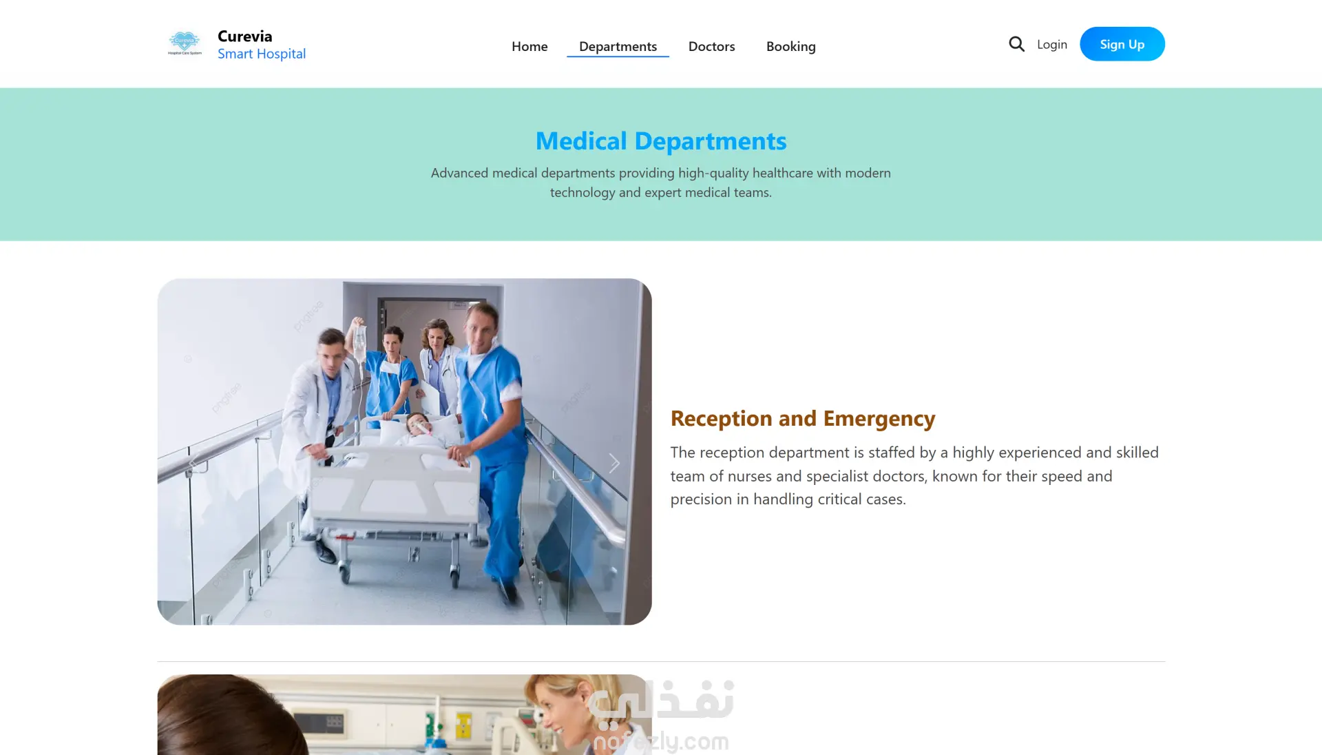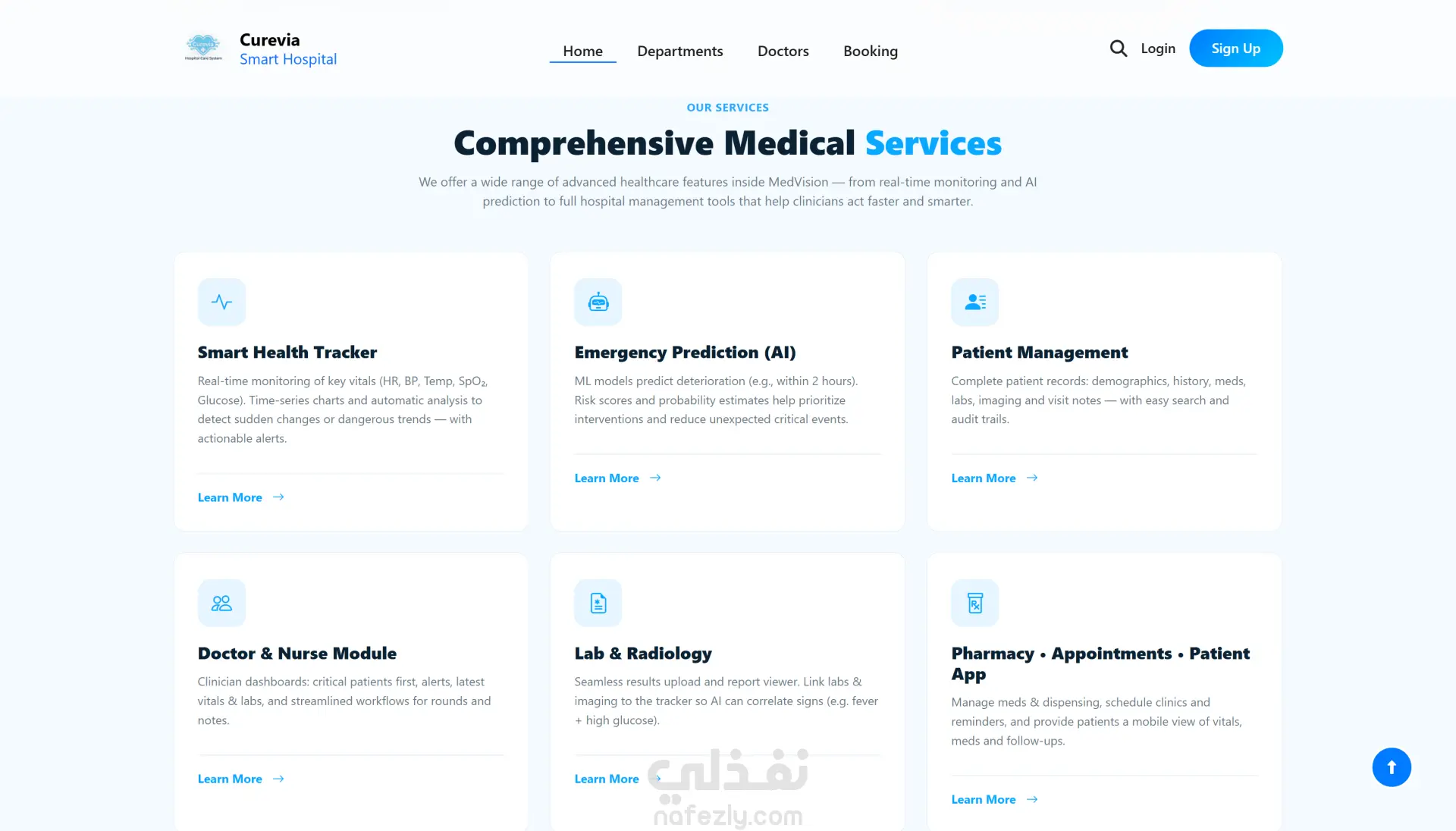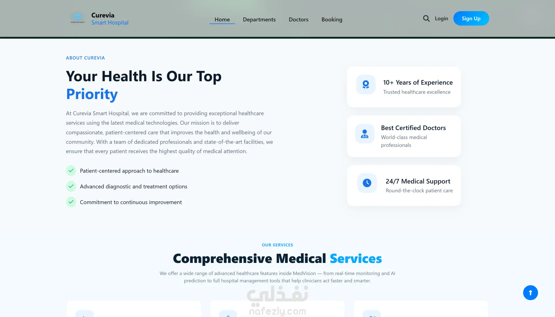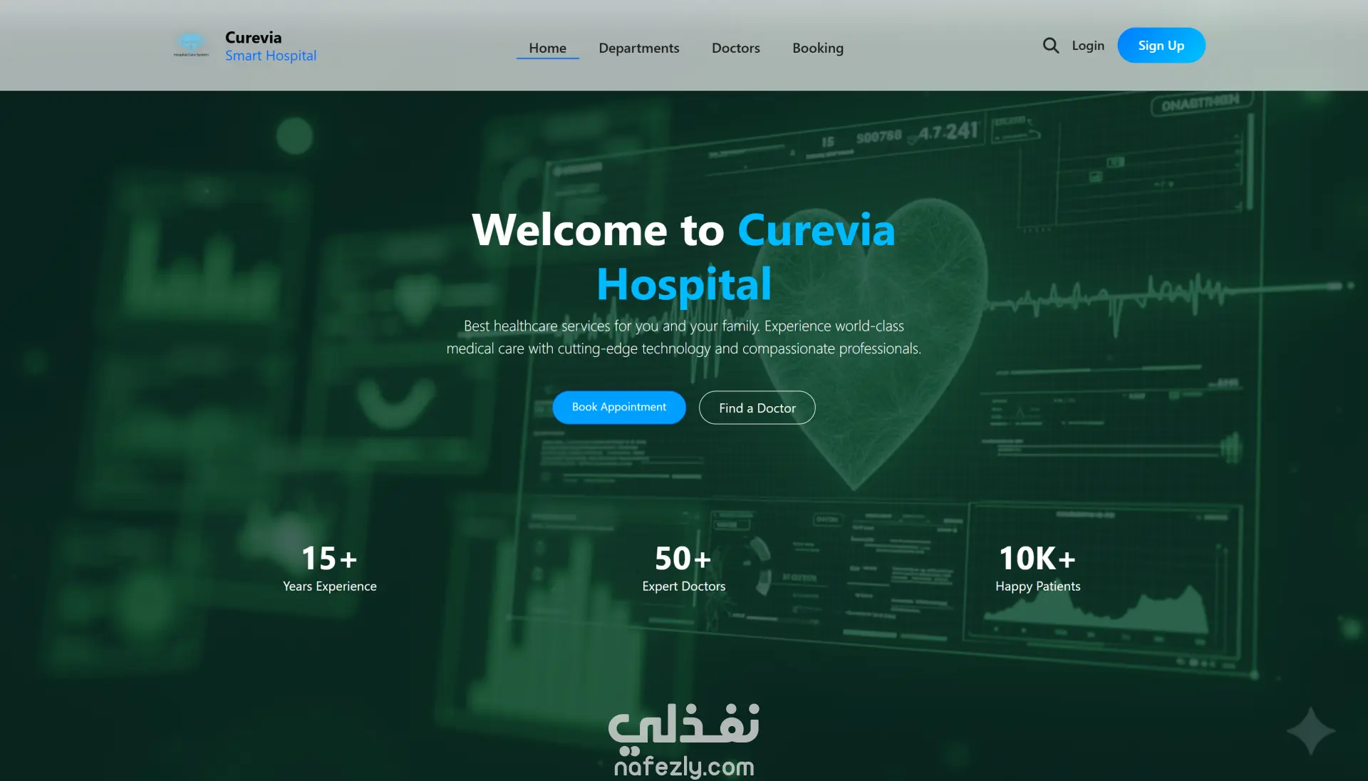 قمت بتصميم وتطوير موقع إلكتروني متكامل لمستشفى ذكي باسم Curevia يهدف إلى تحسين تجربة المرضى وتسهيل إدارة الخدمات الطبية رقميًا.