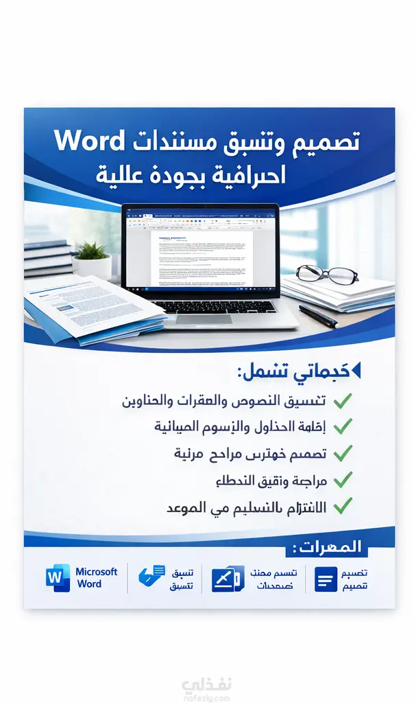 أقدم خدمة إعداد وتنسيق مستندات Word بشكل احترافي لتلبية احتياجاتك الأكاديمية أو العملية. تشمل الخدمة: • إنشاء مستندات Word منظمة وجاهزة للطباعة • تنسيق النصوص والفقرات والعناوين بشكل احترافي • إضافة الجداول والرسوم البيانية والصور • تصميم فهارس ومراجع بطريقة مرتبة • مراجعة المستند وتصحيح الأخطاء الإملائية والنحوية • الالتزام بالمواعيد والتواصل المستمر مع العميل