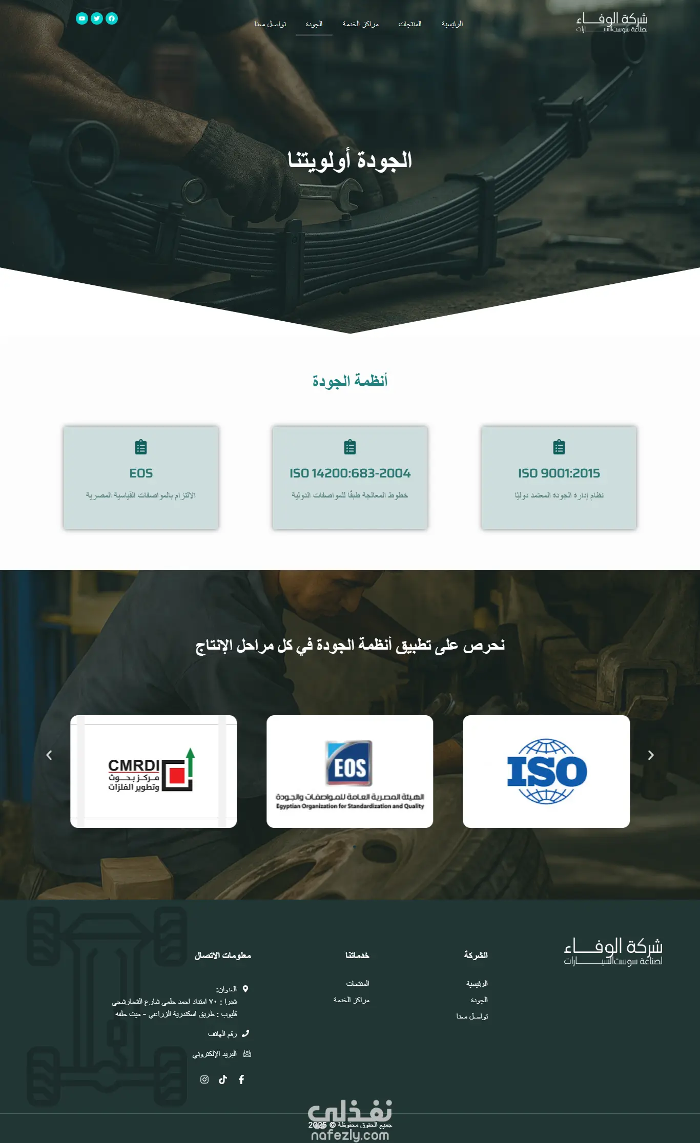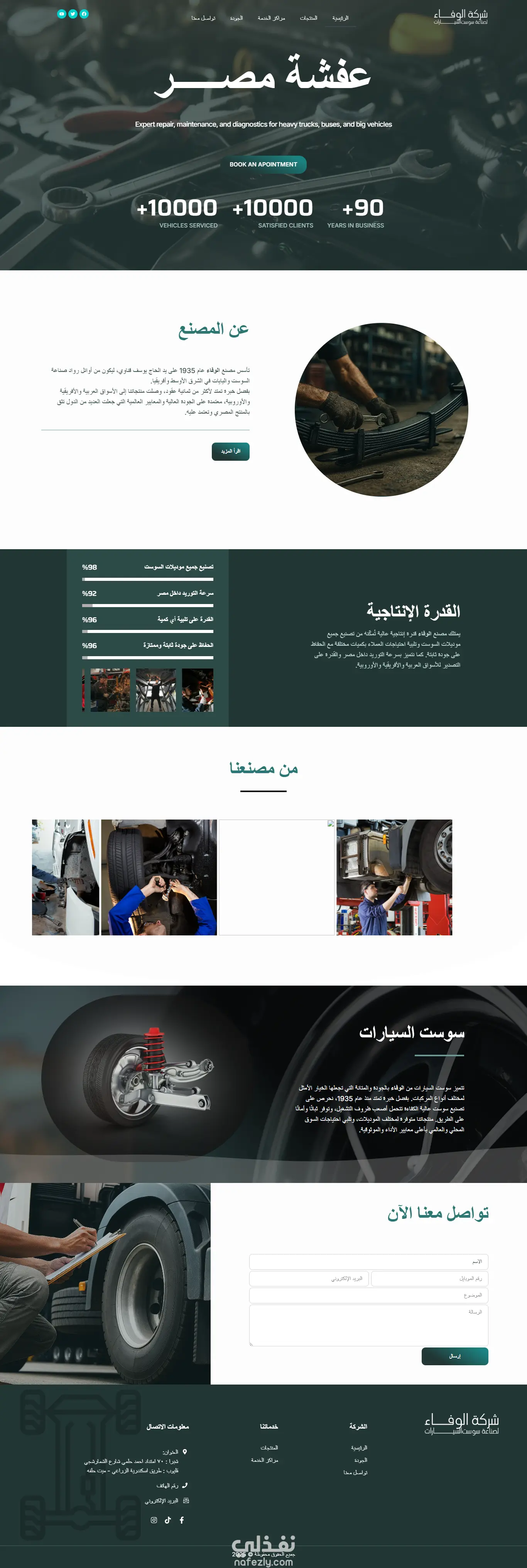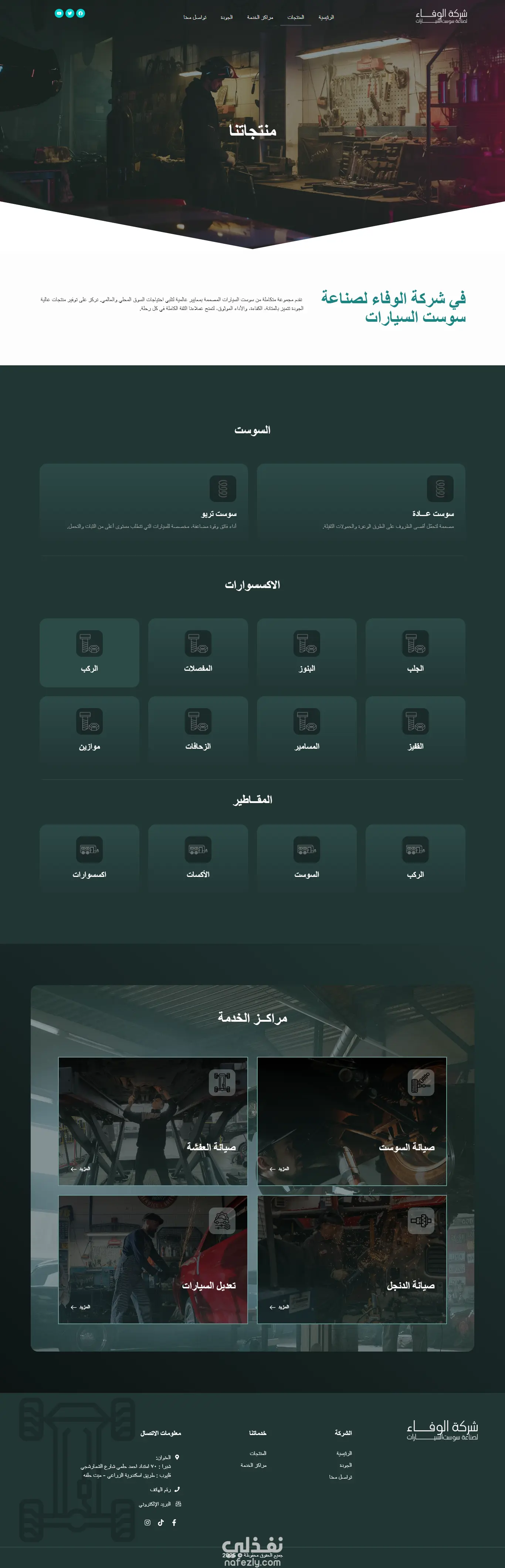 موقع شركة الوفاء لسوست السيارات: تصميم وتطوير موقع إلكتروني باستخدام ووردبريس لعرض منتجات الشركة وخدماتها وإمكاناتها التصنيعية، مع توظيف حركات انتقالية سلسة وتصميم احترافي يعكس هوية الشركة ويعزز تجربة المستخدم.