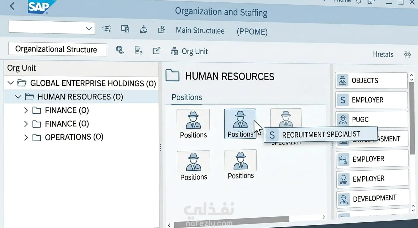 تم اعداد وتنفيذ الهيكل التنظيمي باستخدام وحدة Organizational Management لكى يتوافق مع أهداف المؤسسة، للربط بين الموارد البشرية والعمليات المالية لسهولة تكلفة كل مكان على حدى وكذلك لسهوله اعداد بطافات الوصف الوظيفى تفاصيل العمل: 1- بناء الوحدات التنظيمية (Organizational Units) وفقاً للهيكل الإداري المعتمد للمؤسسة. 2- تعريف الوظائف (Jobs) وربطها بالمناصب (Positions) لضمان دقة التسكين الوظيفي. 3- ربط الوظائف بالإدارات المختلفة وتحديد خطوط التقارير والصلاحيات. 4-إنشاء مصفوفة المسؤوليات (Responsibility Matrix) والقواعد الآلية للتكليفات لربطهاcost senters - يساهم الهيكل التنظيمي في تحسين أداء الشركة من خلال: * دعم اتخاذ القرار: توفير تقارير دقيقة حول توزيع الموظفين ونسب الدوران الوظيفي لكل قسم. * رفع كفاءة التوظيف: تحديد الأوصاف الوظيفية والمؤهلات المطلوبة لكل منصب (Position) بدقة.