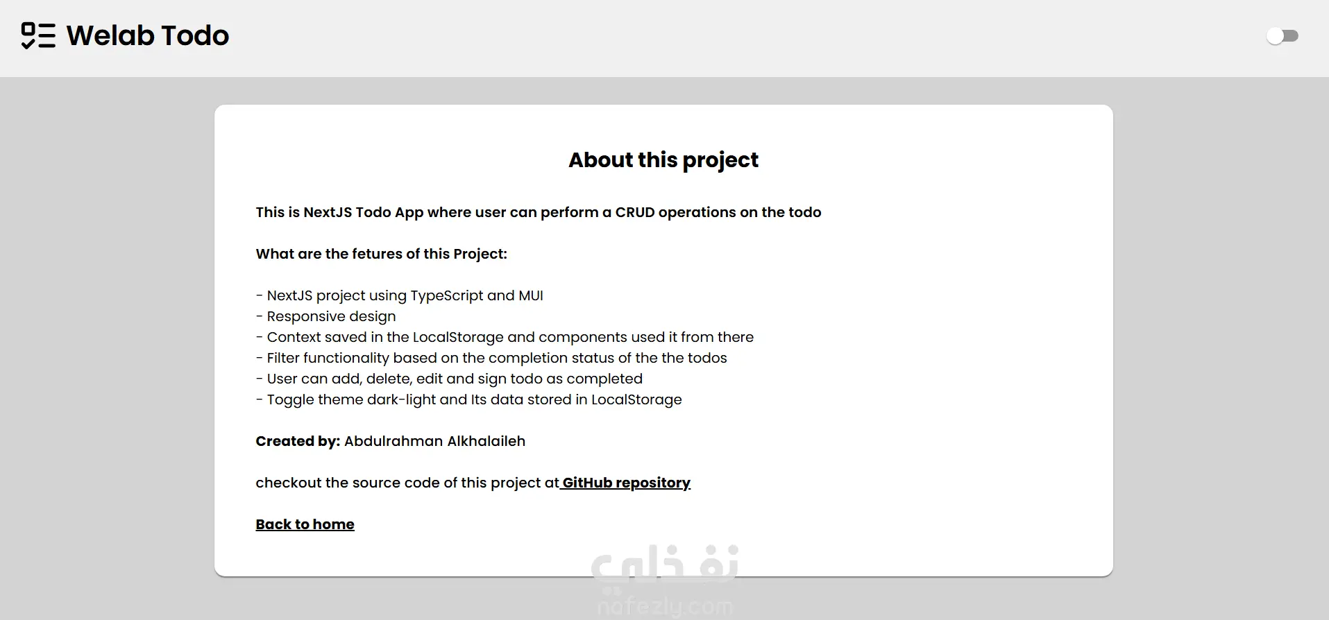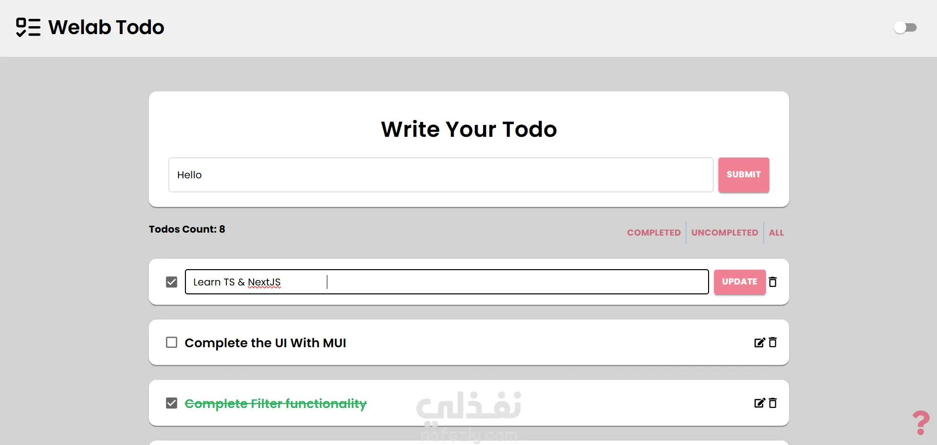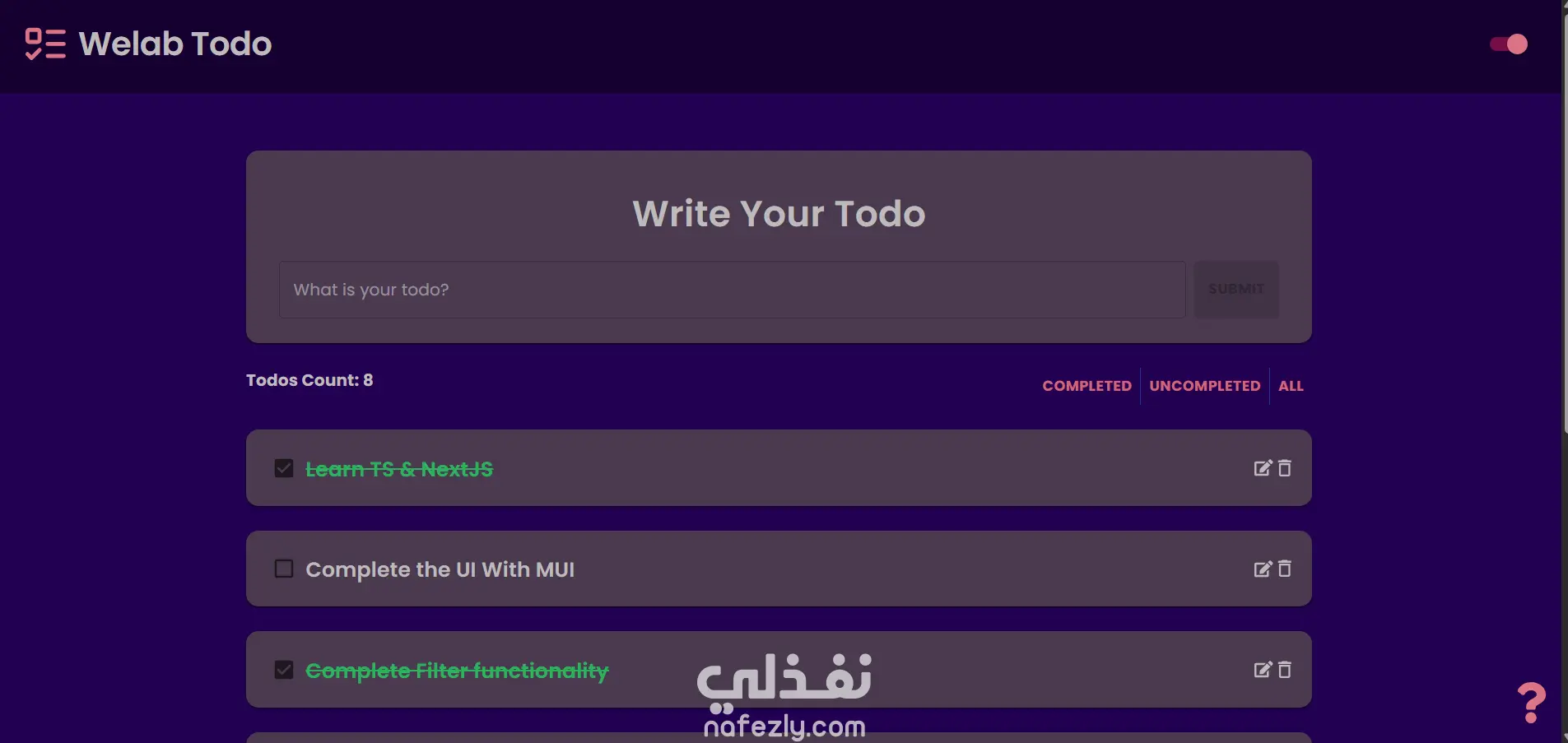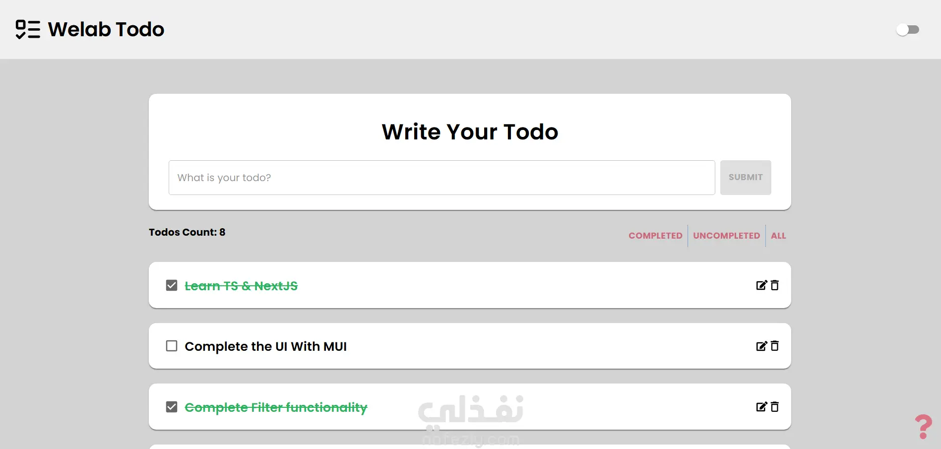 This is NextJS Todo App where user can perform a CRUD operations on the todo What are the fetures of this Project: - NextJS project using TypeScript and MUI - Responsive design - Context saved in the LocalStorage and components used it from there - Filter functionality based on the completion status of the the todos - User can add, delete, edit and sign todo as completed - Toggle theme dark-light and Its data stored in LocalStorage