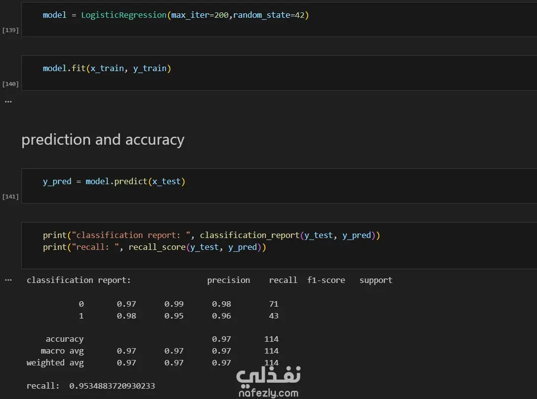 "نموذج تعلم آلة يهدف إلى المساعدة في التشخيص الطبي المبكر لسرطان الثدي، من خلال تحليل البيانات السريرية وتصنيف الحالات بدقة عالية. أبرز ما تم إنجازه في المشروع: 1. تحليل البيانات: استكشاف ومعالجة البيانات الطبية لاستخراج الميزات المؤثرة في التشخيص. 2. بناء النموذج: استخدام خوارزميات التصنيف للتفريق بين الأورام الحميدة والخبيثة. 3. تقييم الأداء : اختبار دقة النموذج لضمان موثوقية النتائج في البيئة الطبية. تم تطوير المشروع باستخدام بايثون