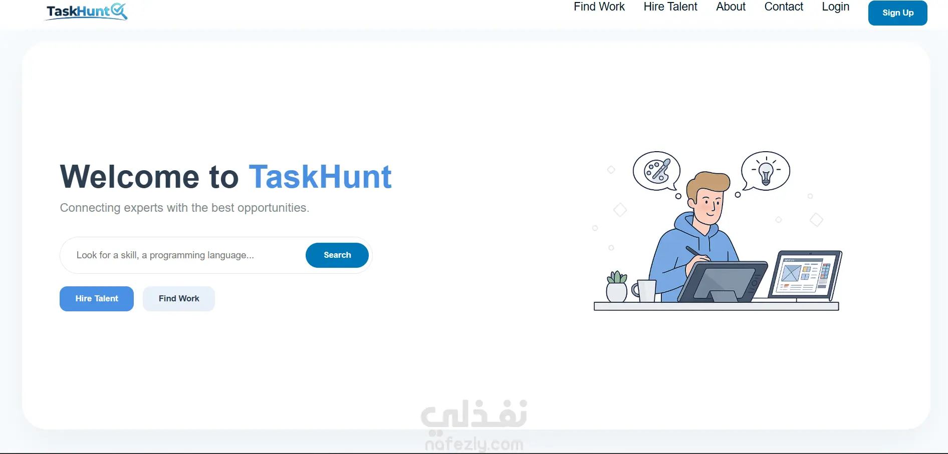 قمت بتصميم وتطوير واجهة الصفحة الرئيسية لمنصة TaskHunt، وهي منصة رقمية تهدف إلى ربط أصحاب الأعمال بالمستقلين بسهولة وسرعة. ركّزت في التنفيذ على بناء واجهة حديثة وواضحة تساعد الزائر على فهم فكرة المنصة خلال ثوانٍ، والتنقل بسلاسة بين البحث عن العمل أو توظيف المستقلين.