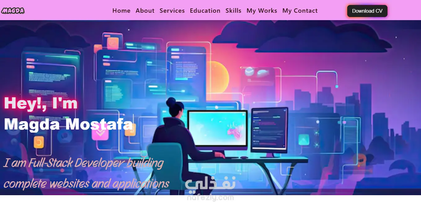 الموقع هو بورتفوليو شخصي لعرض مهاراتك وأعمالك كمطوّرة Front-End. بيقدّم نفسك بشكل احترافي لأي زائر (عميل أو جهة توظيف).
