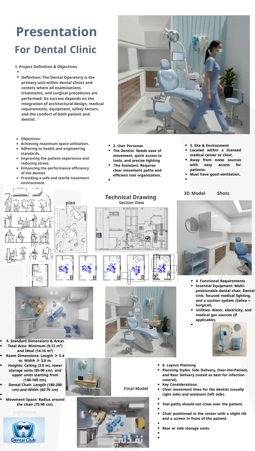 تنفيذ تصميم 3D كامل لعيادة الأسنان يشمل: