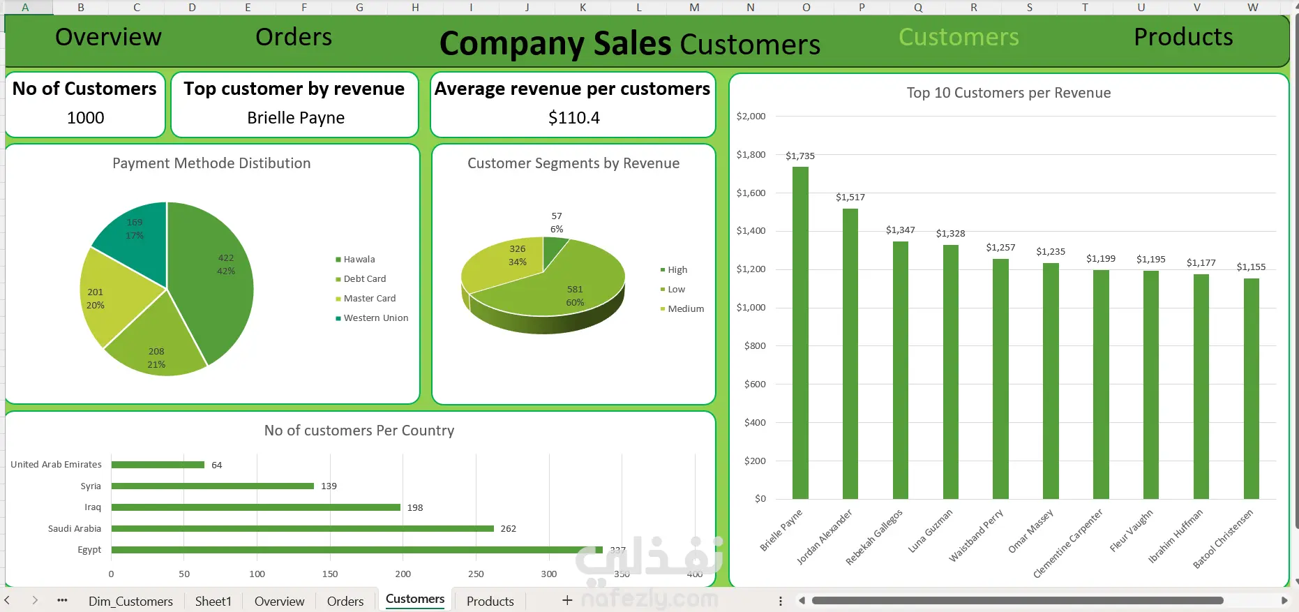في هذا المشروع، قمت بتحويل بيانات خام مشتتة بين عدة أوراق عمل في إكسيل إلى لوحة تحكم تفاعلية متكاملة. بدأت العملية بربط الشيتات باستخدام Power Query، حيث قمت بتنظيف البيانات، معالجة القيم المفقودة، وإنشاء أعمدة حسابية جديدة (Feature Engineering) لتمكين تحليل أعمق للنتائج. 1- نظرة شاملة: الأداء العام (Overview) هذه الصفحة هي "العقل المدبر" للداشبورد، حيث تلخص الحالة الصحية للشركة: الأرقام الكبيرة: حققت الشركة إجمالي مبيعات 380,307$ من خلال 3,445 طلبية لـ 1,000 عميل. الجغرافيا: تتصدر مصر القائمة كأعلى دولة من حيث قيمة المبيعات بـ 127,127$، تليها السعودية بـ 97,430$. حالة الطلبات: الغالبية العظمى من الطلبات مكتملة بنسبة 93%، مع وجود 7% (230 طلبية) لم تكتمل بعد، مما يستدعي المتابعة التشغيلية. 2- تحليل الطلبات: كفاءة التشغيل (Orders) هنا نركز على وتيرة العمل اليومية: اتجاه الطلبات (Trend): نلاحظ ذروة نشاط في عام 2018 بـ 1,834 طلبية، متبوعة بانخفاض تدريجي، مما يتطلب دراسة الأسباب السوقية لهذا التراجع. أبطال المبيعات: يتصدر الموظف Michael Michael قائمة الأكثر مبيعاً بـ 338 طلبية، بفارق كبير عن أقرب منافسيه، مما يجعله نموذجاً يمكن الاستفادة من خبراته لتطوير باقي الفريق. نسبة الإنجاز: حققت الشركة نسبة نجاح في إغلاق الطلبات بلغت 93.3%. 3- تحليل العملاء: من هم الأكثر ولاءً؟ (Customers) الهدف هنا هو فهم سلوك المشتري لزيادة الـ (Retention Rate): العملاء الأكثر قيمة: العميل Brielle Payne هو العميل رقم 1 بإجمالي إنفاق 1,735$. متوسط الإنفاق: يبلغ متوسط الربح من العميل الواحد حوالي 110.4$. طرق الدفع: يفضل العملاء استخدام "حوالة" بنسبة 42%، بينما تأتي بطاقات الائتمان (Master & Debt cards) في مراتب تالية، مما يساعد في توجيه حملات التسويق والخصومات. تقسيم العملاء: تم تقسيم العملاء لشرائح (Segments)، حيث نجد أن 60% من العملاء يقعون في الشريحة ذات العائد المنخفض، بينما 6% فقط يمثلون النخبة (High Revenue). 4- تحليل المنتجات: ماذا يشتري الناس؟ (Products) تحليل لـ 383 منتجاً مختلفاً لمعرفة محركات الربح: المنتج الأكثر مبيعاً: يتصدر IFX Item من حيث العائد المادي بإجمالي 4,995$. حجم المبيعات: من حيث عدد الوحدات، نجد تقارباً كبيراً بين المنتجات، حيث يتصدر AIU Item بـ 42 وحدة مباعة. المخزون والقرار: تساعد هذه البيانات الإدارة في معرفة المنتجات التي تحتاج "إعادة طلب" (Restock) والمنتجات الراكدة التي قد تحتاج عروضاً ترويجية.