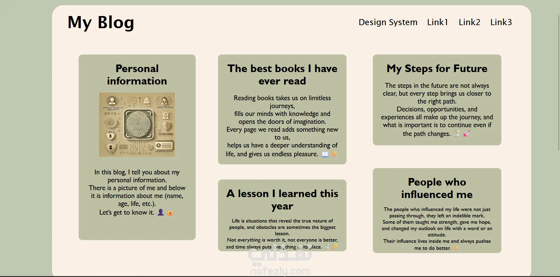 "قمت بتصميم وتطوير واجهة مدونة شخصية (Personal Blog) متكاملة، تهدف إلى عرض المحتوى النصي بأسلوب عصري ومنظم. أهم مميزات المشروع: Navigation System: يحتوي الموقع على قائمة علوية (Navbar) بها روابط فعالة بالكامل؛ حيث تم ربط كل قسم بالمكان المخصص له بدقة لضمان تجربة مستخدم سلسة. Layout Design: استخدام نظام البطاقات (Cards) المنظم لعرض المعلومات الشخصية والمقالات، مما يسهل عملية القراءة والتصفح. UI Aesthetics: اختيار ألوان هادئة ومتناسقة تعزز من جاذبية المحتوى وتبرز التفاصيل الهامة. Interactive Elements: دمج أيقونات وصور تعبيرية متوافقة مع محتوى كل بطاقة لإضافة لمسة جمالية واحترافية. Clean Code: تم بناء الصفحة باستخدام HTML5 و CSS3 بكود نظيف يضمن استقرار الروابط وسرعة التنقل بين الأقسام."
