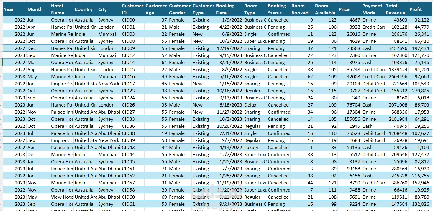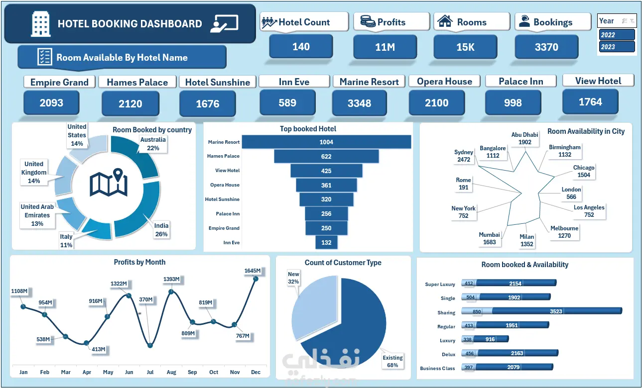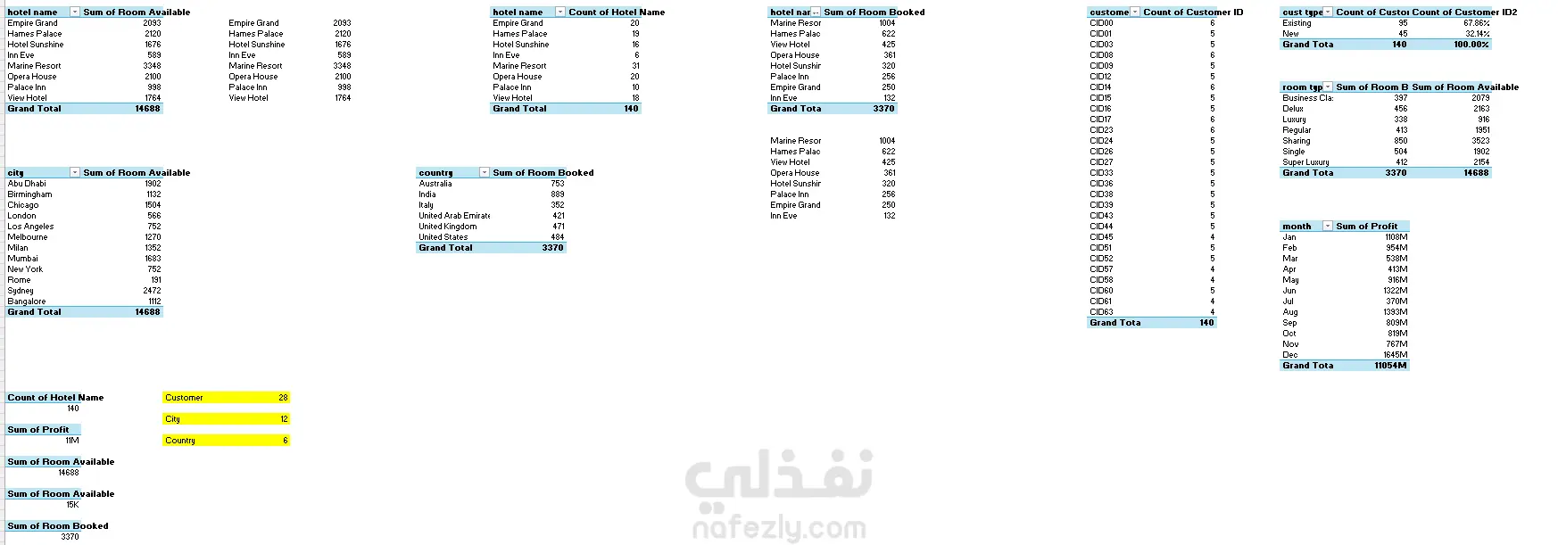 يقدم هذا المشروع لوحة معلومات تفاعلية لحجوزات الفنادق تم إنشاؤها باستخدام Microsoft Excel لتحليل أداء حجوزات الفنادق خلال عامي 2022–2023.تعمل لوحة المعلومات على تحويل بيانات الحجوزات الخام إلى رؤى مرئية واضحة تساعد في تتبع الإيرادات، وعدد الحجوزات، وتوافر الغرف، وسلوك العملاء. الهدف من هذه اللوحة هو: مراقبة الأداء العام للفنادق تحديد الفنادق والمدن الأعلى أداءً تحليل اتجاهات الحجوزات بمرور الوقت مقارنة توافر الغرف مقابل الطلب عليها فهم تقسيم العملاء (عملاء جدد مقابل عملاء حاليين) الأدوات والتقنيات المستخدمة: الجداول المحورية (Pivot Tables) المخططات المحورية (Pivot Charts) معادلات Excel بطاقات مؤشرات الأداء (KPI Cards) أدوات التصفية (Slicers) – فلتر السنة للتفاعل فرز البيانات وتجميعها مؤشرات الأداء الرئيسية (KPIs): إجمالي الربح: 11 مليون إجمالي الحجوزات: 3370 إجمالي الغرف: 15 ألف عدد الفنادق: 140 تحليل لوحة المعلومات والرؤى أفضل فندق من حيث الأداء: يُعد Marine Resort الأعلى في عدد الحجوزات (1004)، يليه Hames Palace ثم View Hotel. الحجوزات حسب الدولة: تمثل الهند أعلى نسبة حجوزات (26%)، تليها أستراليا (22%). تقسيم العملاء: 68% عملاء حاليون 32% عملاء جدد وهذا يشير إلى قوة في الاحتفاظ بالعملاء. اتجاه الأرباح الشهري: تم تسجيل أعلى ربح في شهر ديسمبر وجود تذبذب ملحوظ خلال أشهر منتصف العام يُظهر الربع الرابع (Q4) أداءً أقوى بشكل عام أداء أنواع الغرف: تحقق غرف Sharing أعلى حجم حجوزات مقارنة بأنواع الغرف الأخرى مثل Deluxe وBusiness Class وLuxury. توافر الغرف حسب المدينة تُظهر مدينتا سيدني ومومباي مستويات توافر عالية، مما يدل على سعة فندقية كبيرة في هاتين المدينتين. ماذا تعلمت من المشروع بناء لوحات مؤشرات أداء منظمة استخدام الجداول المحورية للتحليل الديناميكي إنشاء فلاتر تفاعلية باستخدام Slicers عرض الرؤى التجارية بشكل واضح ومرئي تحويل البيانات الخام إلى رؤى قابلة للتنفيذ
