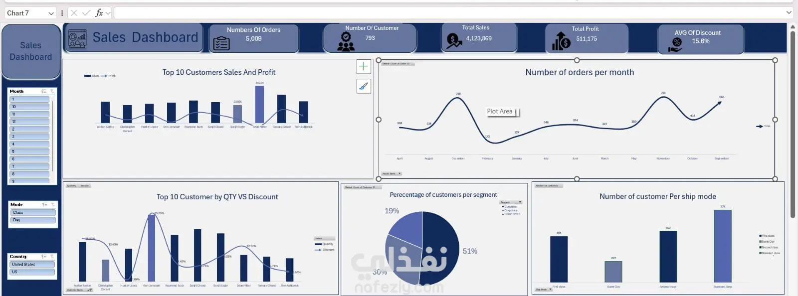 التفاعلية الذكية: استخدام "المقسمات" (Slicers) على يسار اللوحة لفلترة البيانات فوراً حسب الشهر، الدولة، أو فئة الشحن، مما يجعل التقرير مرناً وقابلاً للتخصيص.