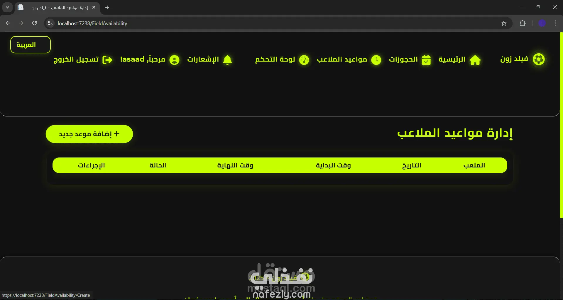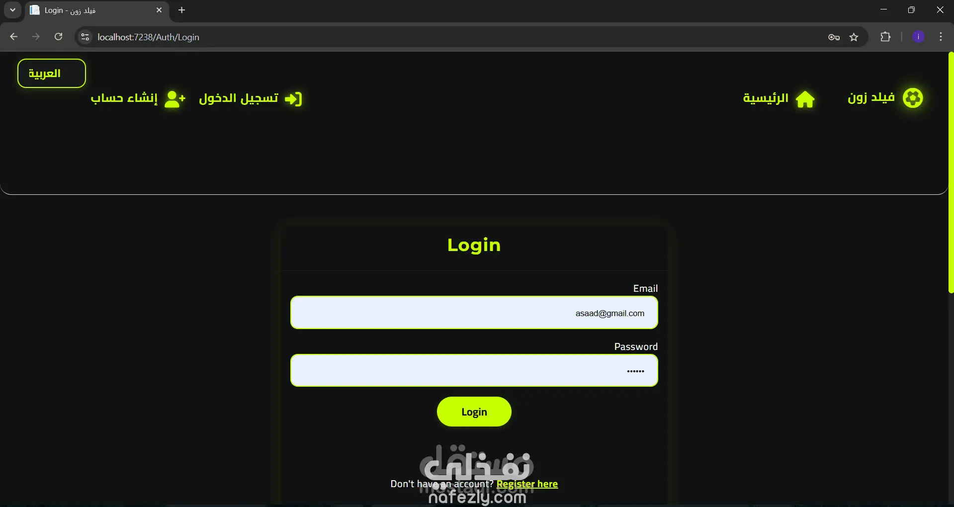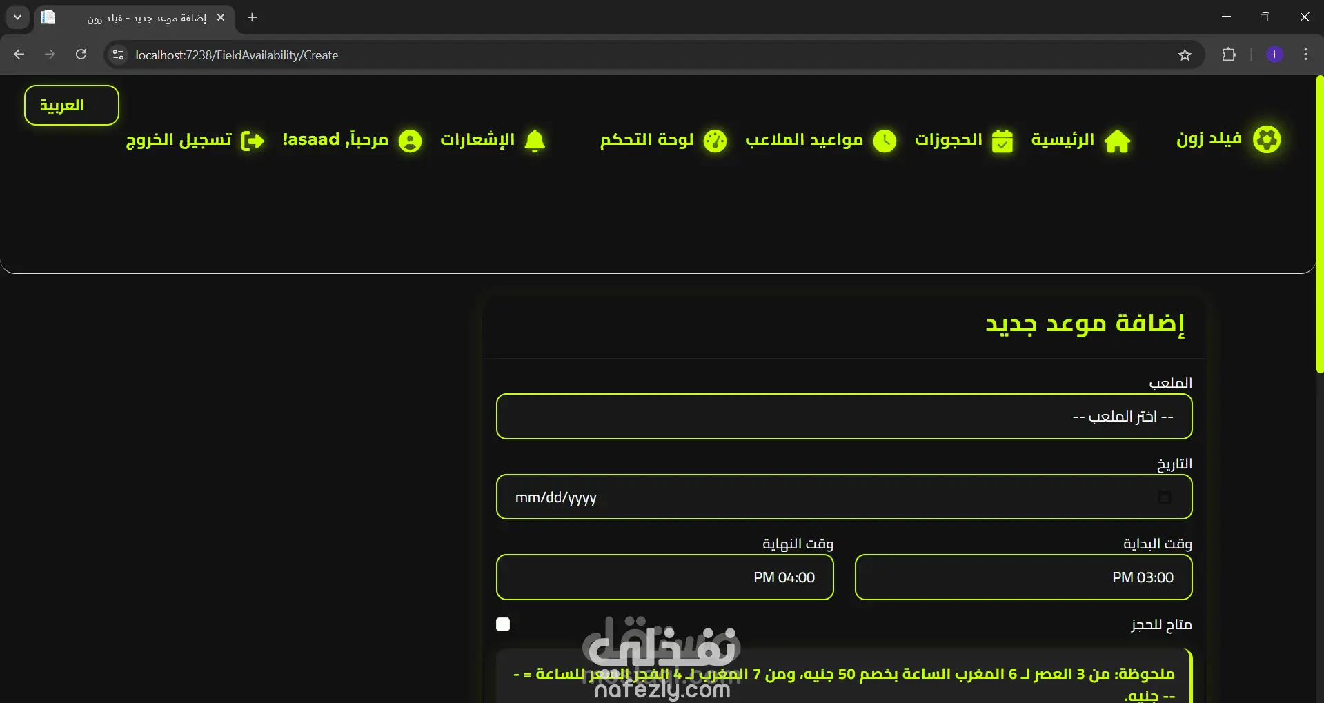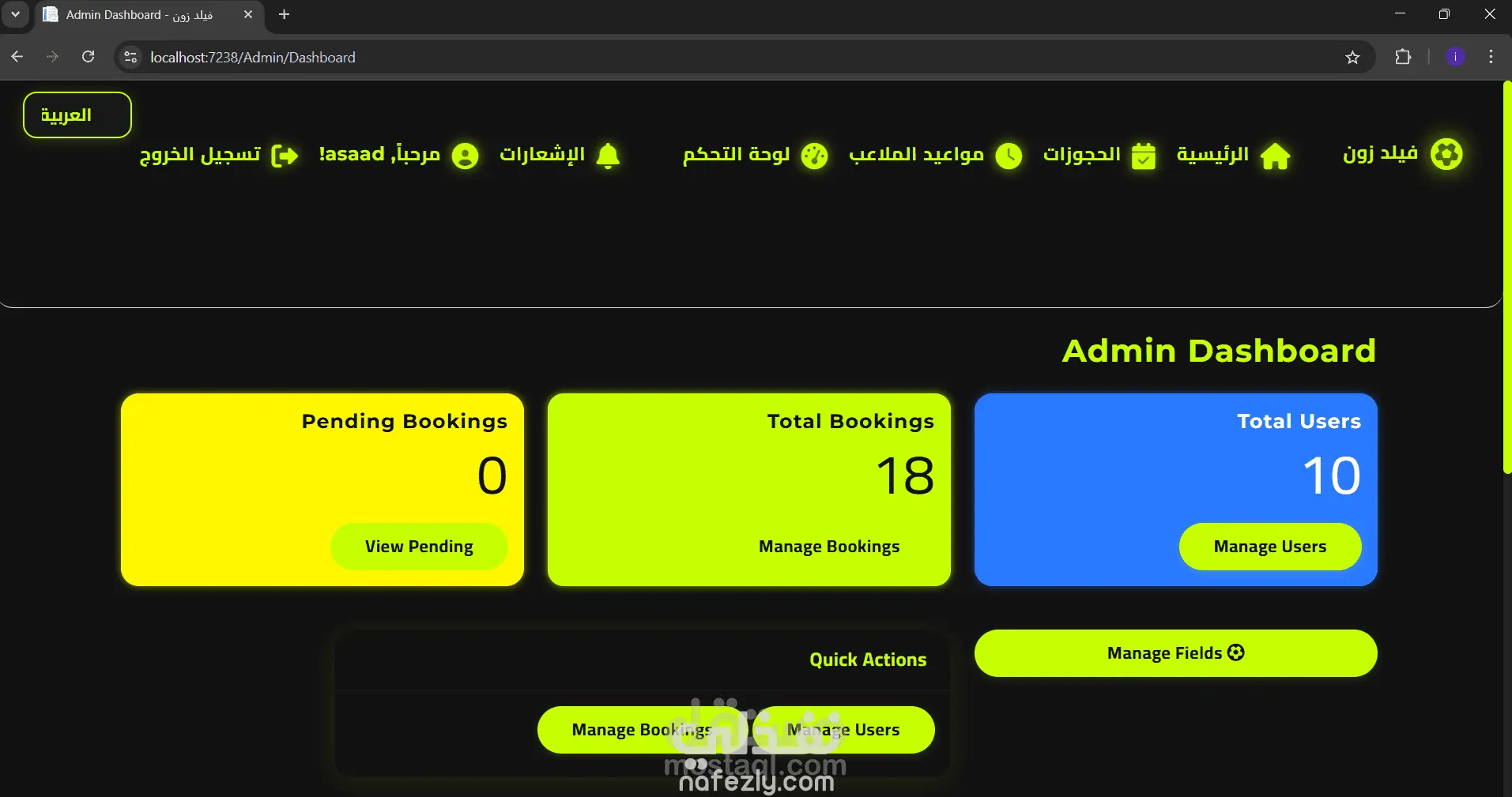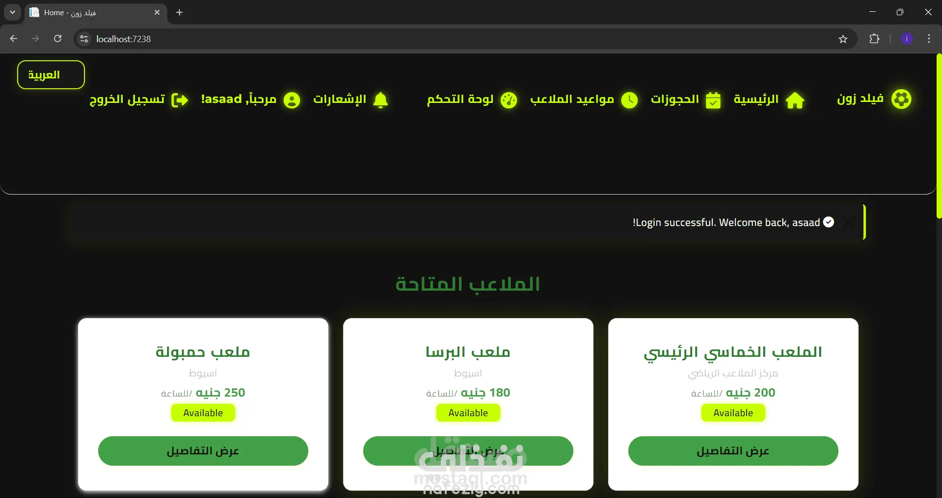 نظام حجز ملاعب كرة قدم إلكتروني وصف المشروع قمت بتطوير نظام لحجز ملاعب كرة القدم أونلاين يتيح للمستخدمين معرفة المواعيد المتاحة والحجز بسهولة، مع لوحة تحكم للإدارة لمتابعة الحجوزات والمستخدمين. جزء المستخدم: إنشاء حساب وتسجيل دخول عرض الملاعب المتاحة وأسعار الساعة معرفة حالة الملعب (متاح / غير متاح) حجز موعد محدد بتاريخ ووقت معين استقبال إشعار بعد تسجيل الدخول عرض مواعيد الحجز الخاصة بالمستخدم جزء الإدارة: لوحة تحكم تحتوي على إحصائيات (إجمالي الحجوزات – المستخدمين – الحجوزات المعلقة) إدارة المستخدمين إدارة الملاعب إضافة مواعيد جديدة وتحديد وقت البداية والنهاية التحكم في إتاحة الموعد للحجز مراجعة وإدارة الحجوزات تم تنفيذ منطق لمنع تداخل المواعيد وضمان عدم حجز نفس الفترة مرتين. التقنيات المستخدمة: ASP.NET Core MVC C# Entity Framework Core SQL Server Identity Bootstrap