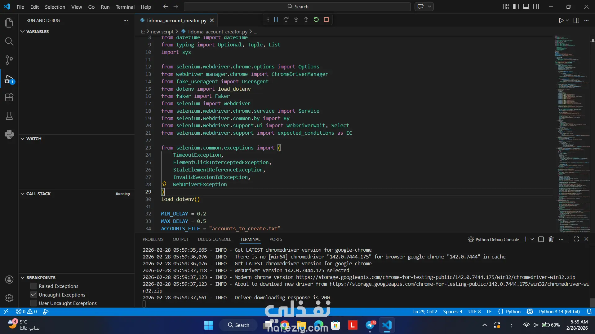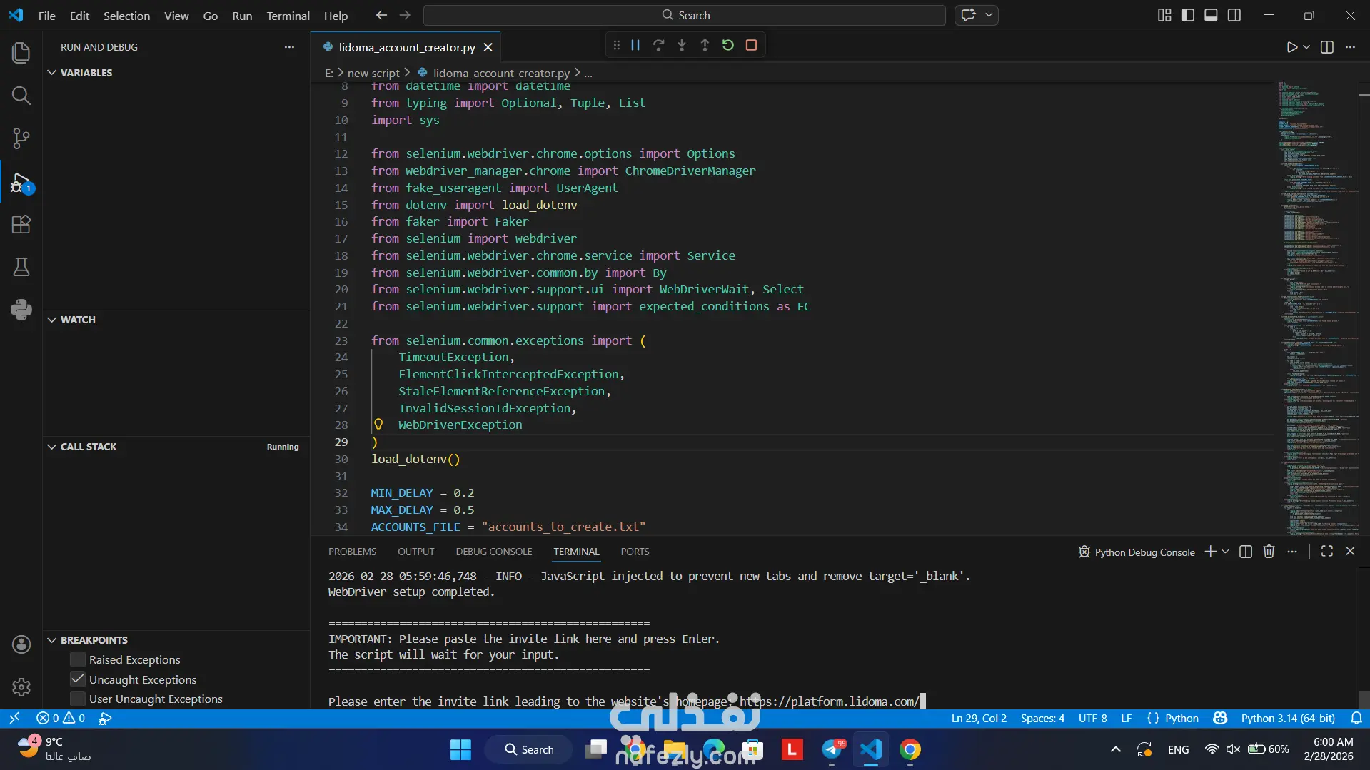 قمت بتطوير نظام أتمتة متكامل باستخدام لغة Python ومكتبة Selenium لمحاكاة تفاعل المستخدم الحقيقي مع المواقع الإلكترونية وأتمتة عملية إنشاء الحسابات بطريقة ذكية ومنظمة. النظام قادر على التعامل مع الصفحات الديناميكية، النوافذ المنبثقة، تأكيد العمر، إدارة الجلسات، واكتشاف الأخطاء أثناء التسجيل، مع وجود آلية إعادة المحاولة وإعادة تشغيل المتصفح في حالة حدوث أعطال. تم تصميم المشروع بأسلوب احترافي يراعي هيكلة الكود، معالجة الاستثناءات، وتسجيل العمليات (Logging) بشكل منظم. ⚙️ أهم المميزات التقنية في المشروع أتمتة تعبئة نماذج التسجيل بشكل ديناميكي توليد أسماء مستخدمين فريدة مع منع التكرار نظام إعادة المحاولة عند فشل التسجيل إعادة تشغيل WebDriver تلقائيًا عند حدوث خطأ التعامل مع رسائل الخطأ (مثل البريد المستخدم مسبقًا أو اسم مستخدم محجوز) إدارة ملفات الإدخال والإخراج (CSV و TXT) تسجيل الأحداث والأخطاء باستخدام Logging System إعداد المتصفح بطريقة تقلل احتمالية اكتشاف الأتمتة إيقاف مؤقت لحل CAPTCHA يدويًا ثم استكمال العملية