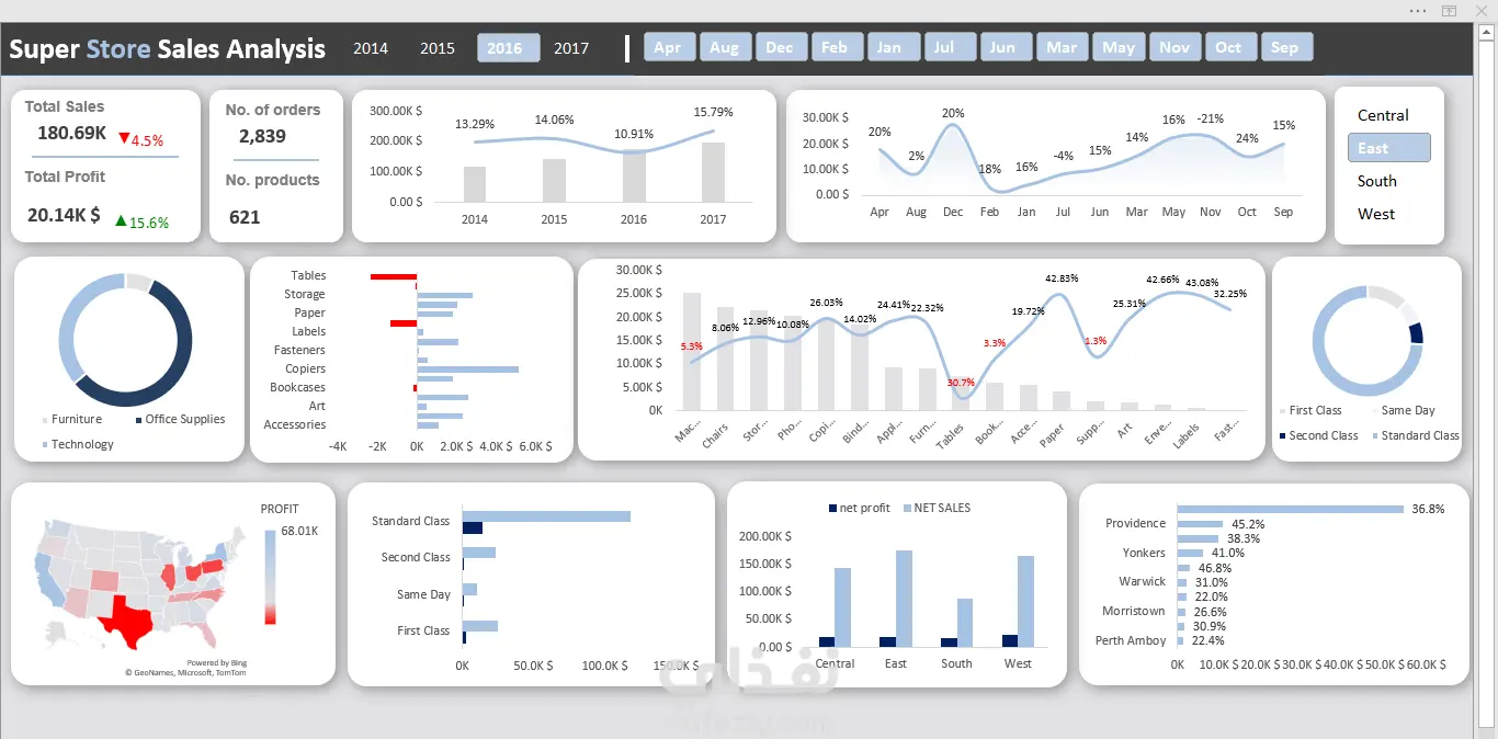 مقارنة الأداء: تحليل سنوي (YoY) يُظهر زيادة بنسبة 15.6% في الأرباح رغم الانخفاض الطفيف في حجم المبيعات. التحليل الجغرافي المكاني: دمج خريطة الولايات المتحدة لتحديد الولايات ذات الأرباح العالية (تكساس ومناطق الساحل الشرقي). تحليل معمق للمنتجات والفئات: تحليل لـ 17 فئة فرعية، مع تسليط الضوء على قطاع "التكنولوجيا" كأكبر محرك للإيرادات. تحديد المنتجات "الخاسرة": (تمثيل بياني بأعمدة سالبة) لتقديم توصيات بشأن تصفية المخزون. نظرة عامة على اللوجستيات: تحليل طرق الشحن (مع ظهور "الشحن القياسي - Standard Class" كأكثر الطرق استخداماً). المهارات التقنية المستعرضة: تصميم واجهة وتجربة المستخدم (UI/UX): استخدام تخطيطات مخصصة، وظلال، ونظام تنقل سلس لتقديم تجربة مستخدم احترافية. سرد البيانات (Data Storytelling): تحويل الأرقام المعقدة إلى رؤى تجارية قابلة للتنفيذ (مثل: تحديد الأشهر الأكثر ربحية). تنظيف البيانات: التعامل مع مجموعات بيانات ضخمة لضمان دقة مؤشرات الأداء الرئيسية (KPIs) ونسب النمو. 💡 لماذا يضيف هذا قيمة للأعمال؟ هذه اللوحات ليست مجرد رسوم بيانية؛ بل هي أدوات تجارية تساعد أصحاب القرار على تحديد أين ينبغي استثمار ميزانيات التسويق (أيام الجمعة / الربع الرابع) وما هي المنتجات التي تحتاج إلى تحسين (الفئات ذات الهامش الربحي المنخفض)