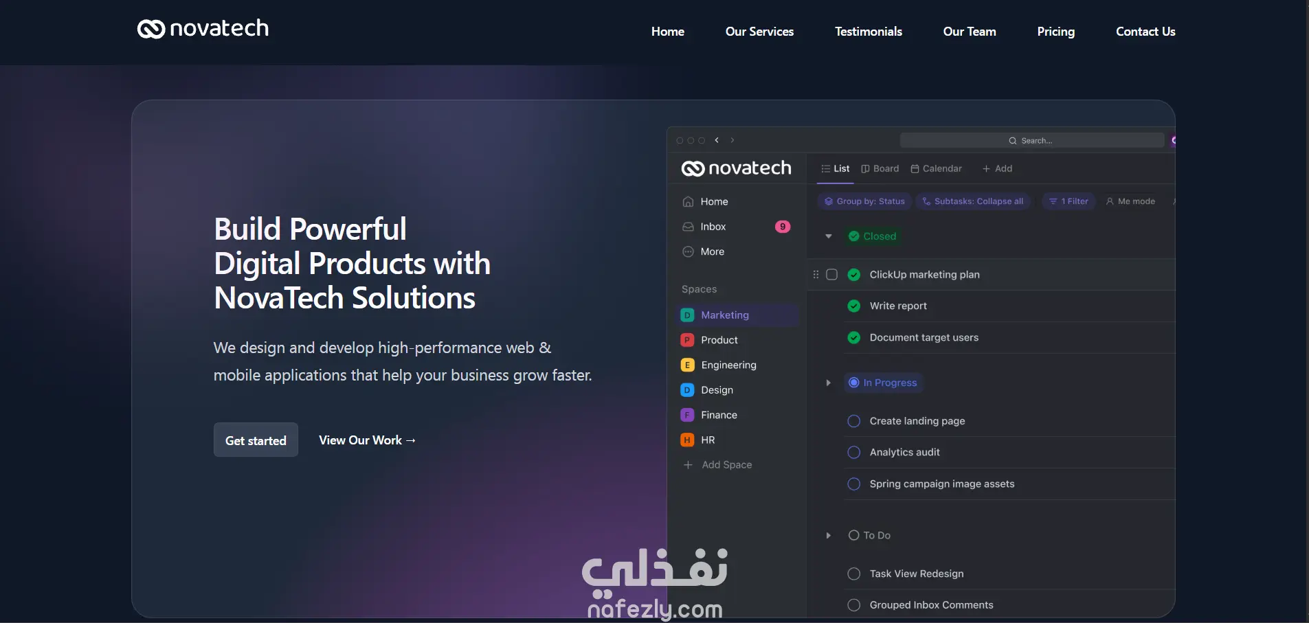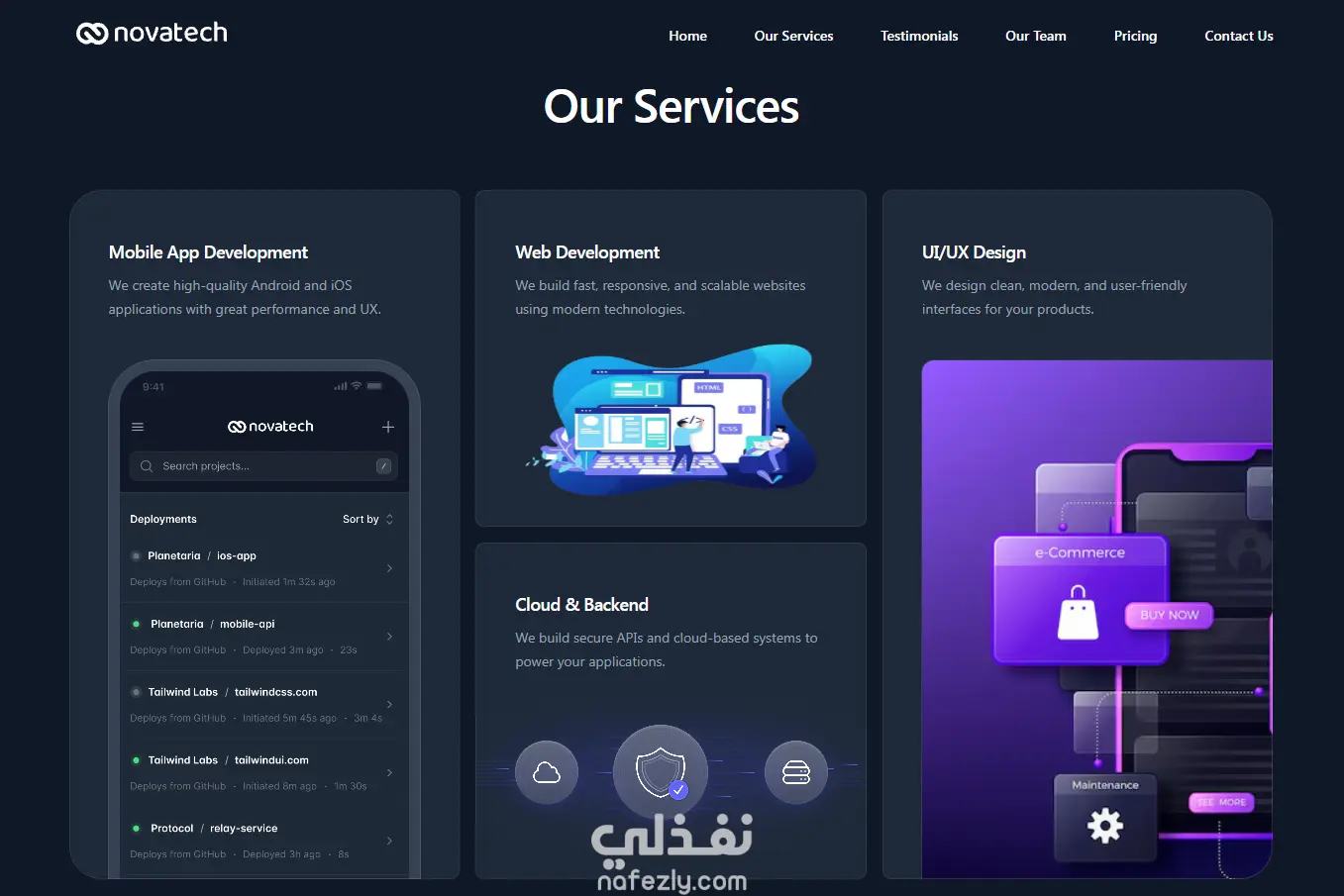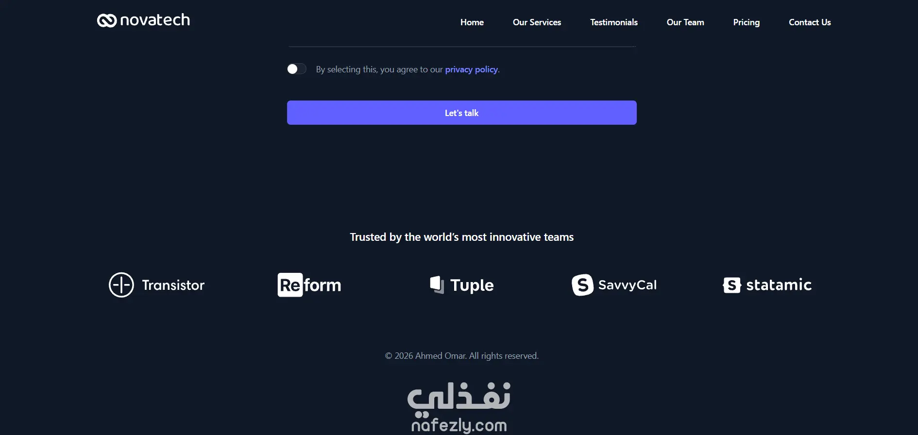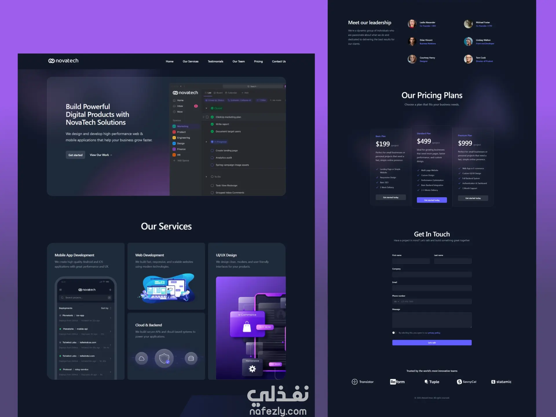 مشروع Nova Tech هو صفحة هبوط حديثة ومتجاوبة بالكامل لشركة حلول برمجية، مصممة بعناية لعرض خدمات الشركة، ميزات المنتجات، آراء العملاء، وأقسام الدعوة لاتخاذ إجراء بطريقة جذابة وسلسة. ? الميزات الرئيسية: تصميم متجاوب بالكامل لجميع الأجهزة واجهة نظيفة وعصرية باستخدام Tailwind CSS تحميل سريع وتخطيط محسّن أقسام منظمة بشكل جيد للتسويق إمكانية إضافة تفاعلات باستخدام JavaScript عند الحاجة التقنيات المستخدمة: HTML | Tailwind CSS | JavaScript (اختياري للتفاعلات)