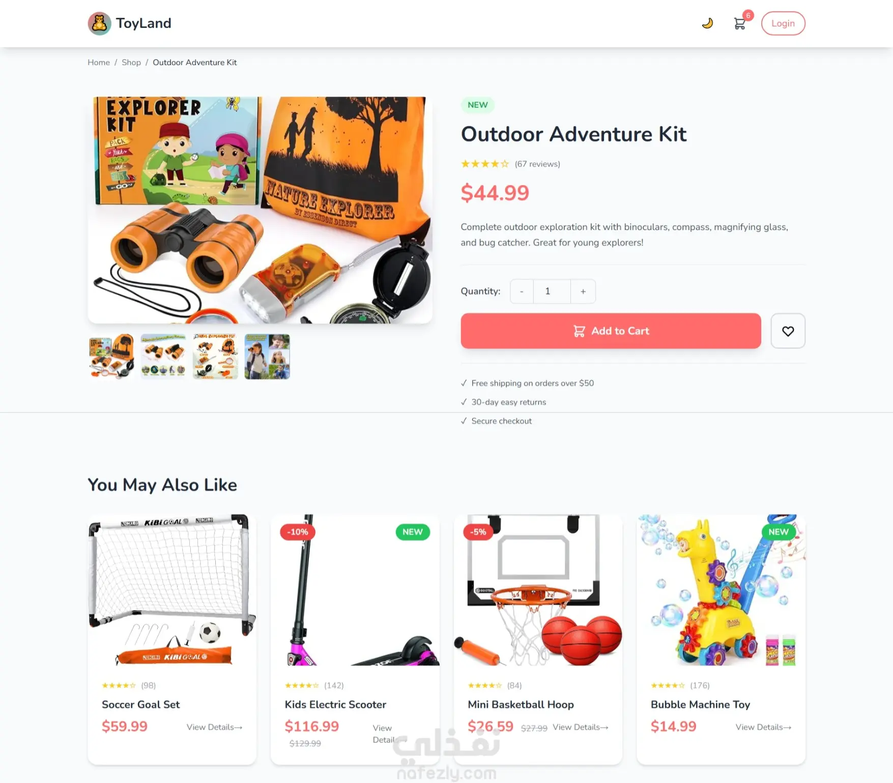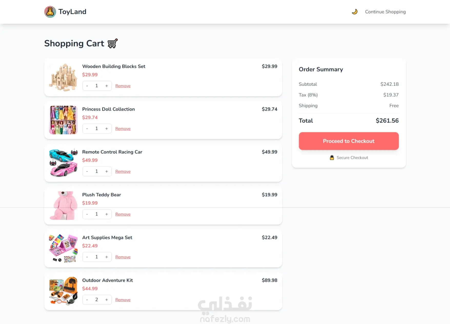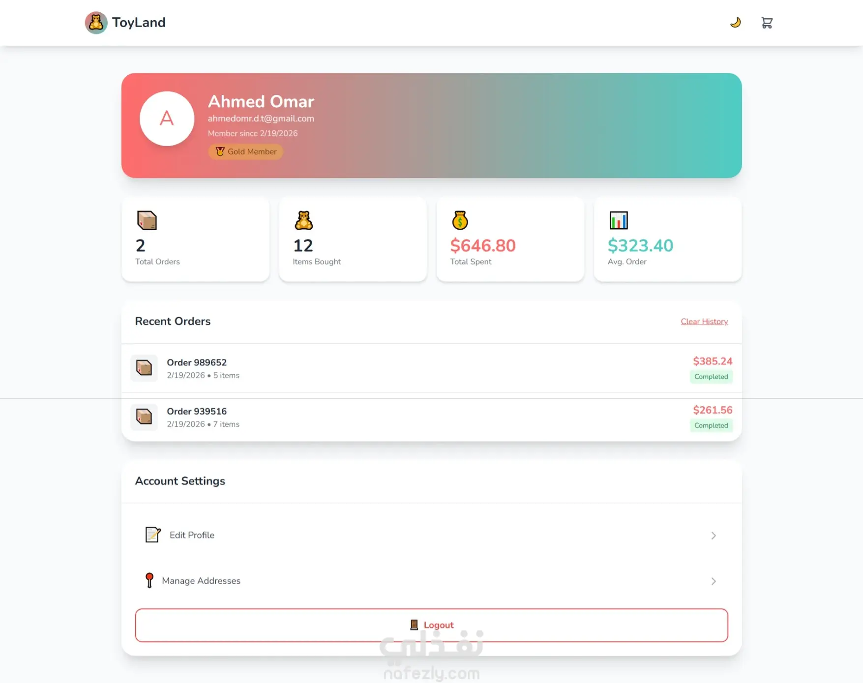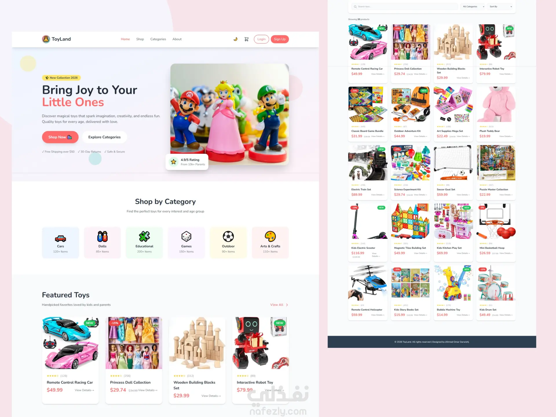 ToyLand-7.jpeg مشروع ToyLand هو موقع تجارة إلكترونية لمتجر ألعاب، مصمم بالكامل ليكون متجاوبًا مع جميع الأجهزة ويدعم الوضع الليلي/الفاتح. يشمل الموقع: - تصفح، فلترة، وترتيب المنتجات - عربة تسوق مع تحديث الكميات وحفظ البيانات - تسجيل دخول وتسجيل مستخدم - صفحات محمية مثل العربة والملف الشخصي - واجهة تفاعلية مع رسوم متحركة وعروض شرائح تم تطوير الموقع باستخدام HTML5، TailwindCSS، وJavaScript (Vanilla) .